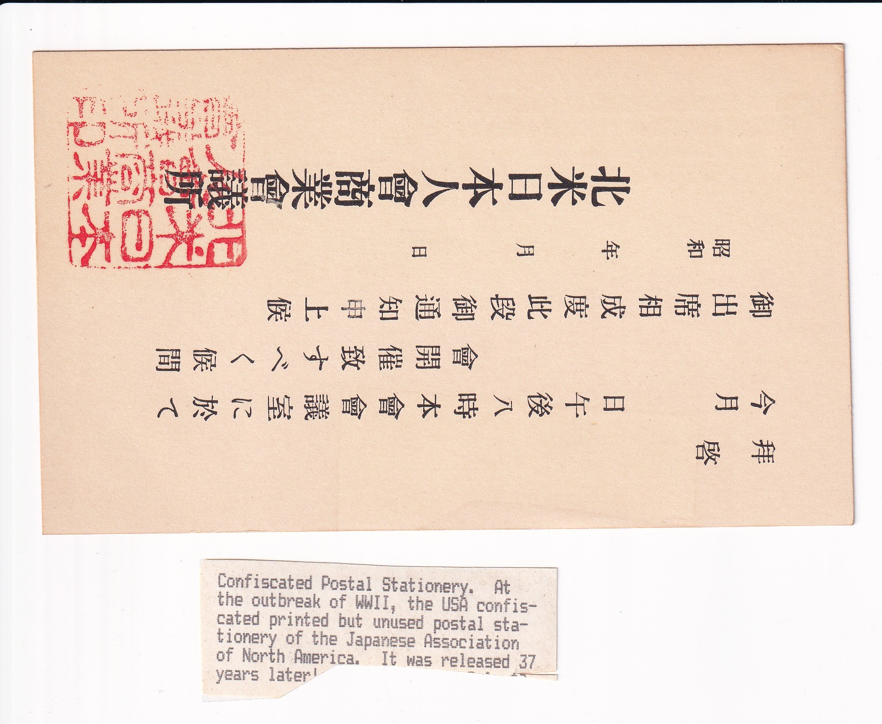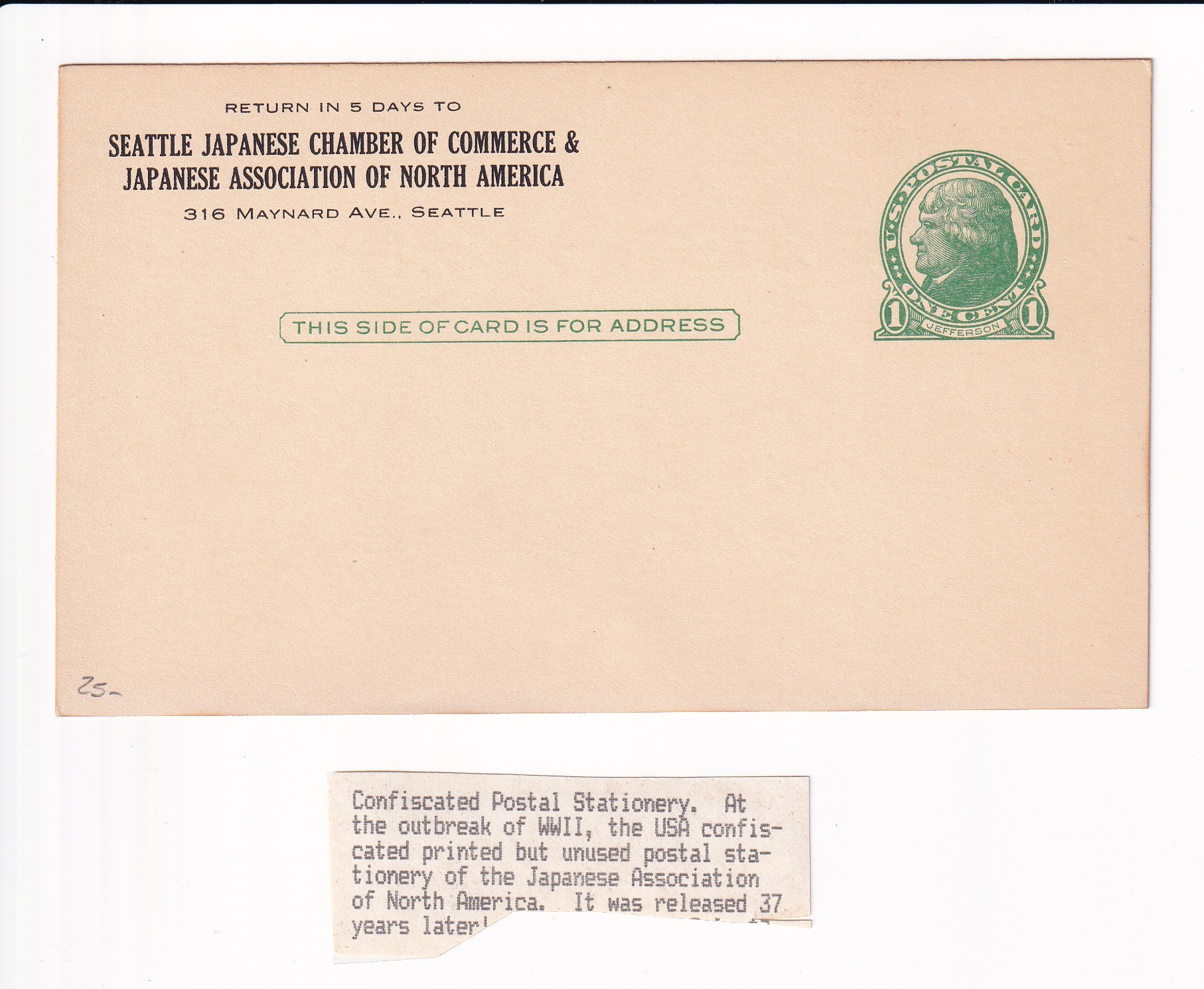 194x UX27 Mint fm Seattle Japanese Chamber of Commerce, Confiscated Postal Stationary. At the outbreak of WW2, the US Govt confiscated these cards and they were released 37 years later. Added Thursday, December 25, 2025