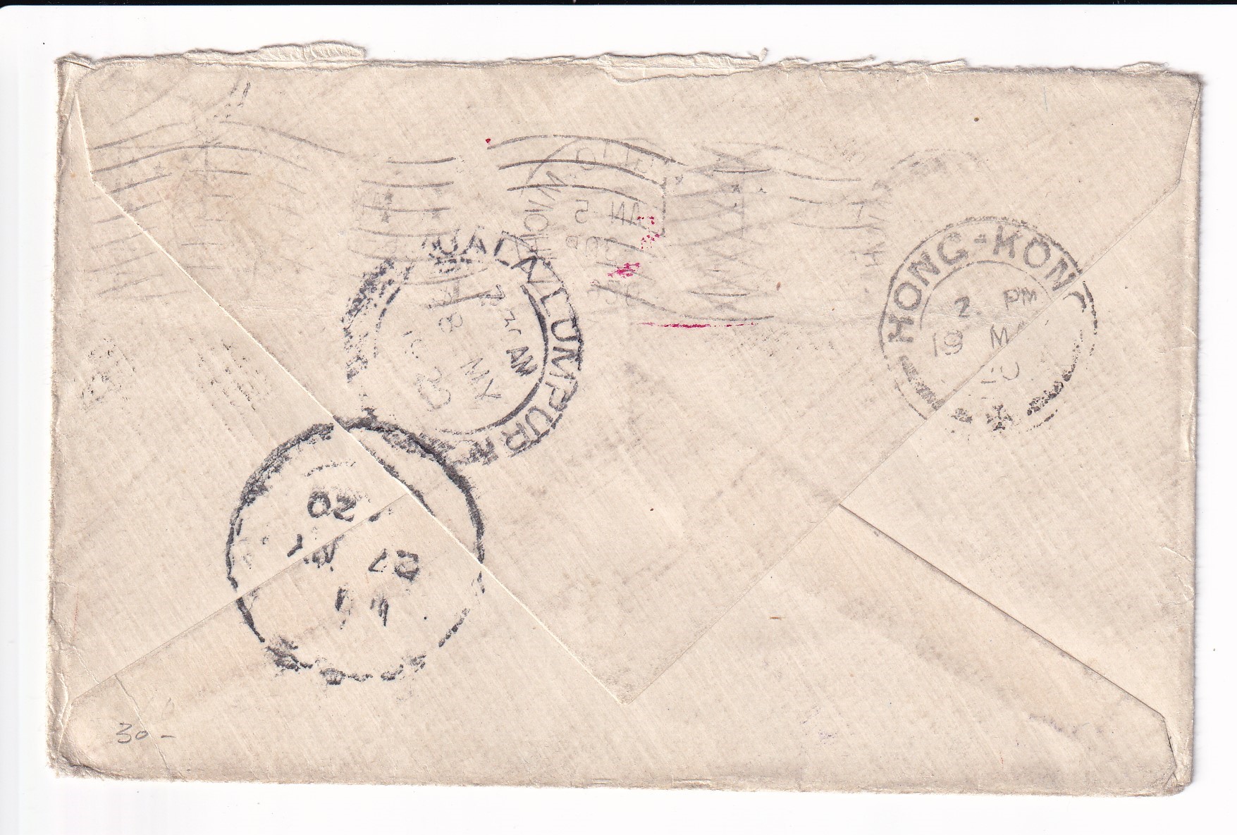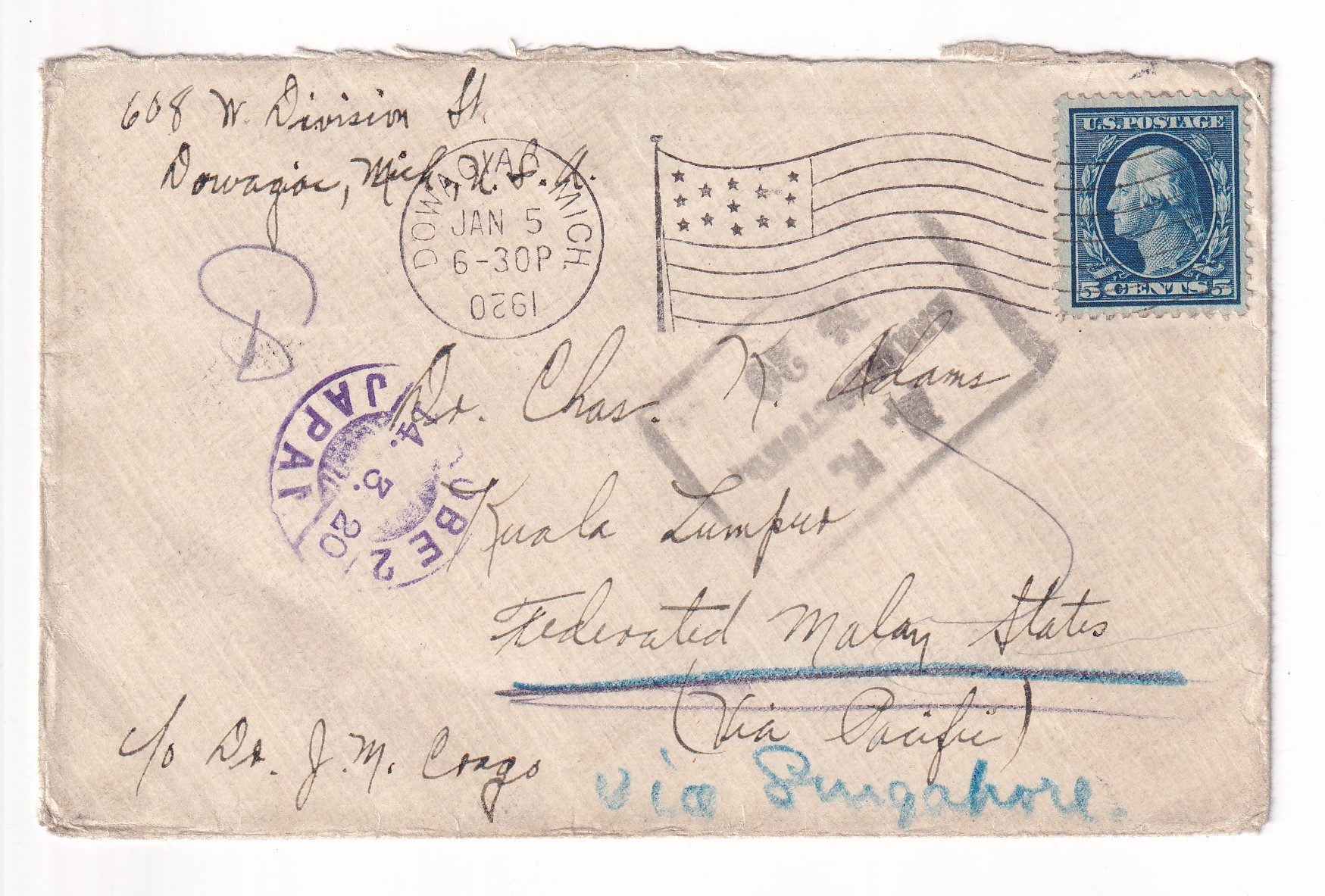 1920 Dowagiac, Mi to Kuala Lumpur, Malaysia, Russian Censor. back stamped Hong Kong & Kuala Lumpur. Added Thursday, December 25, 2025
