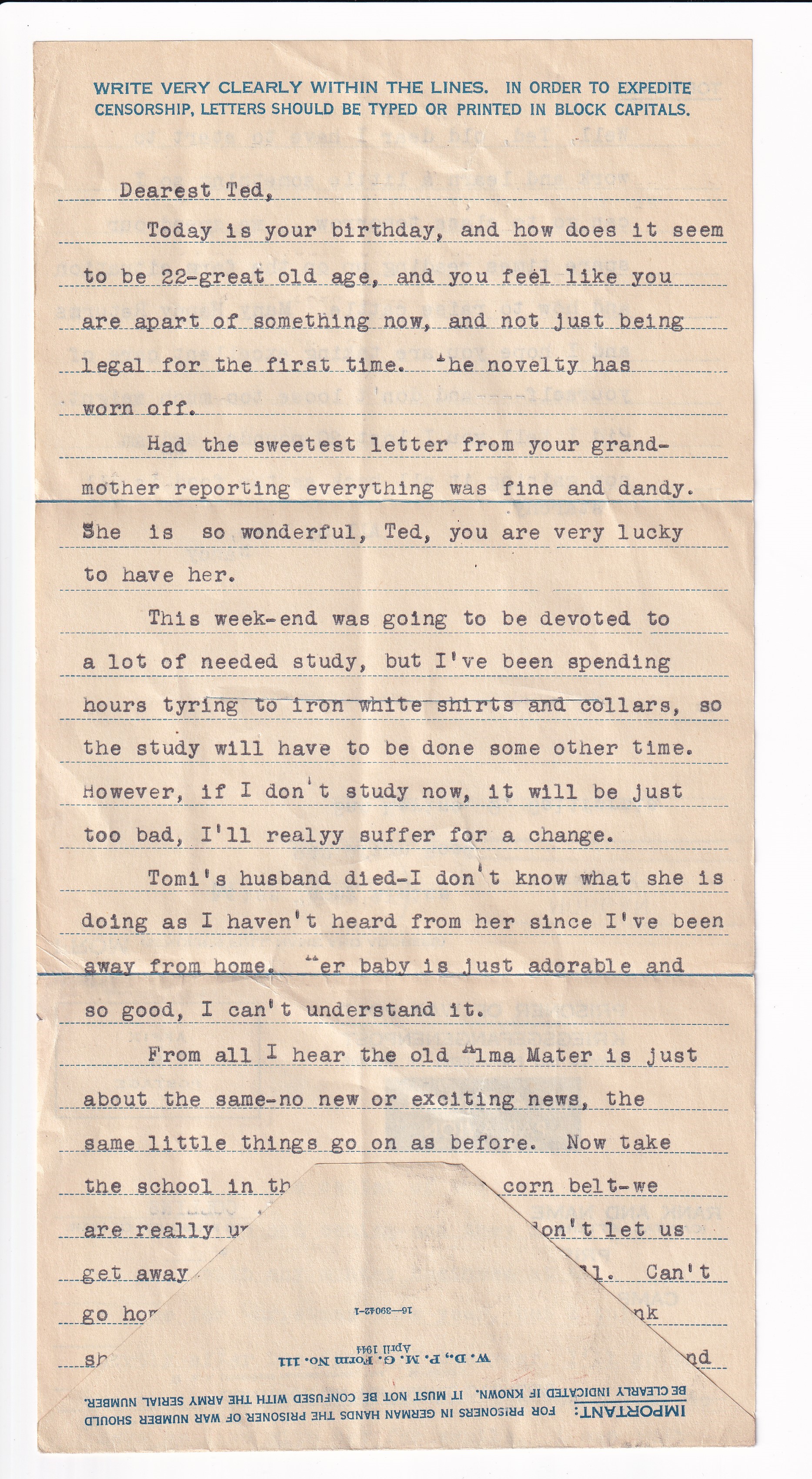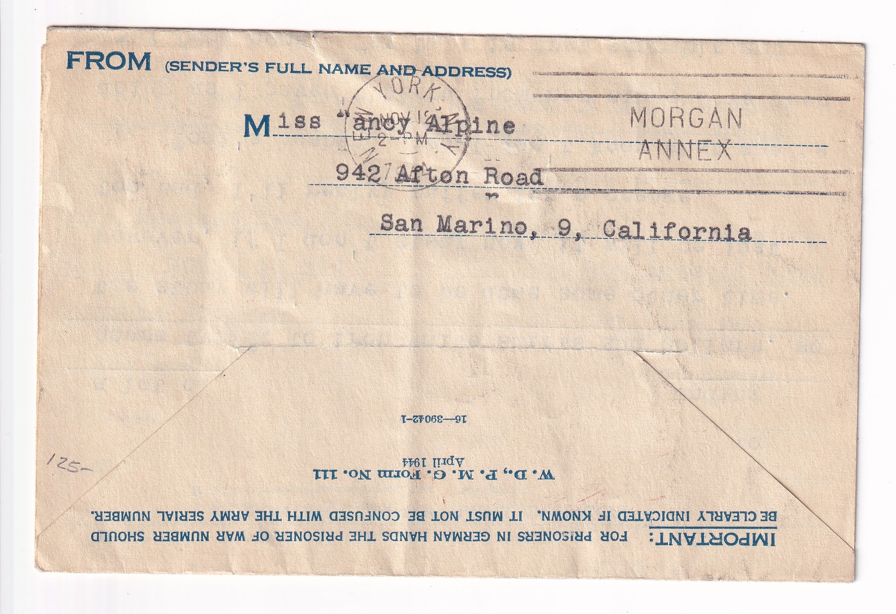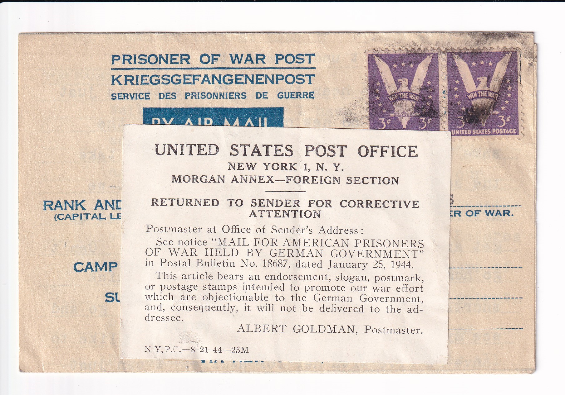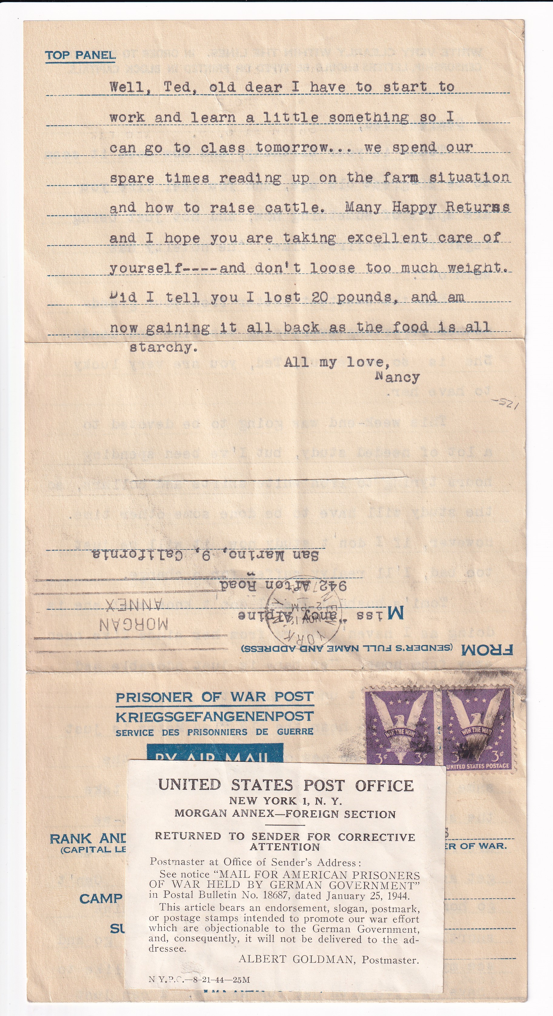 1944 San Marino, Ca to Stalag 2B, Germany, RTS by Censor (Offensive Stamps)(Win the War). Added Thursday, December 25, 2025