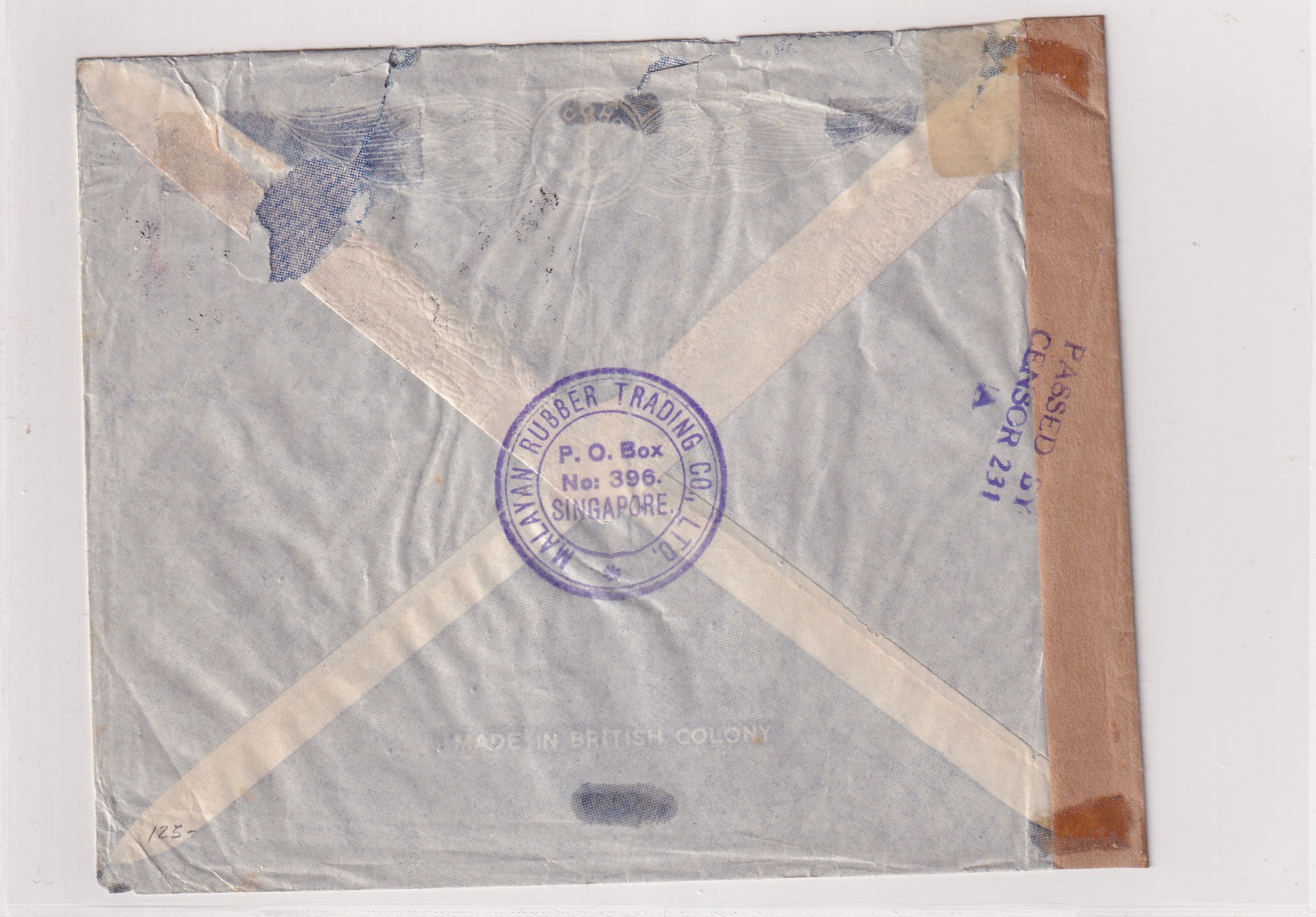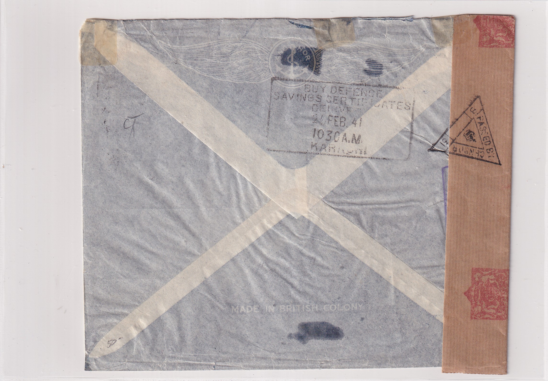 1941 Singapore to Karachi, India Airmail India Censor Tape & Handstamp. back stamped Karachi. Added Sunday, January 18, 2026