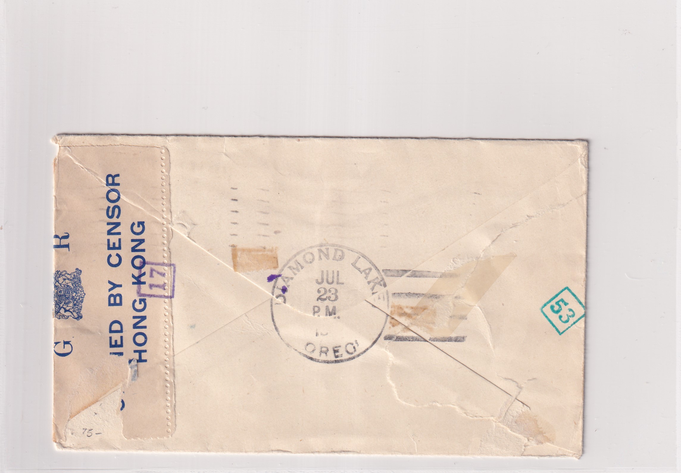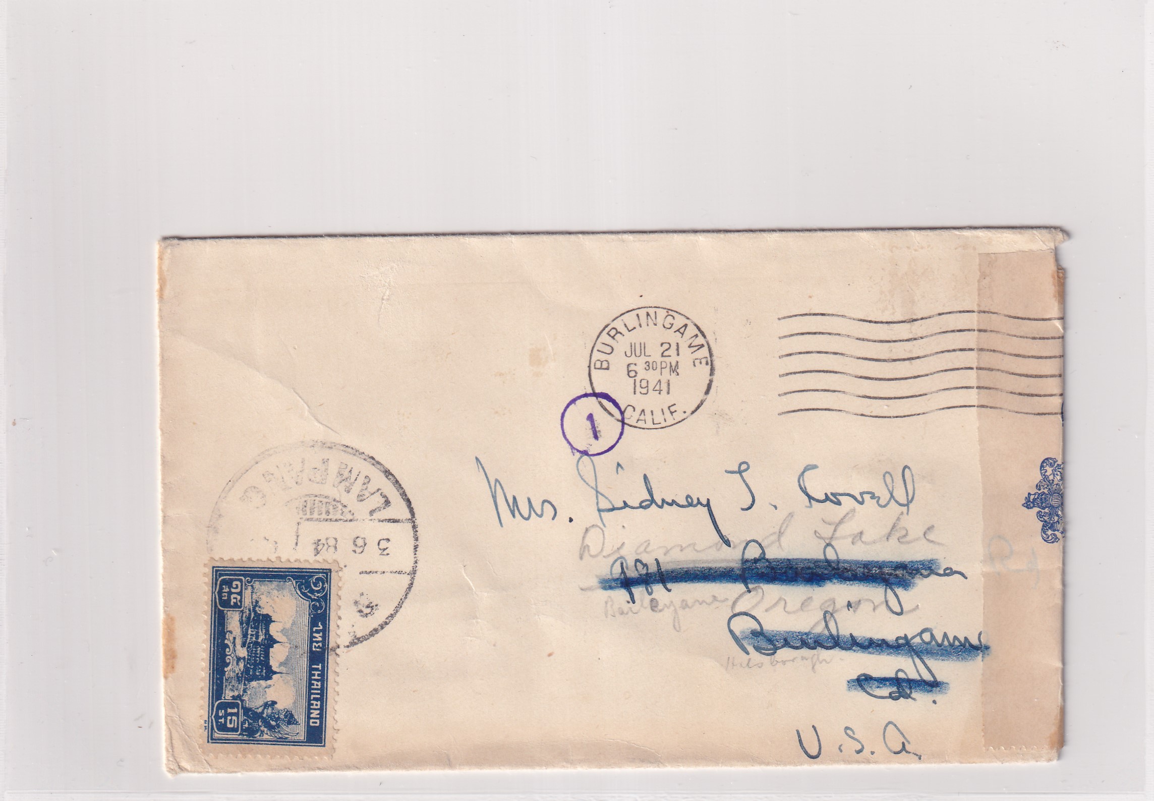 1941 Lampang, Thailand to Burlingame, Ca fwd Diamond Lake, Or Hong Kong Censor Tape. back stamped Diamond Lake. Added Sunday, January 18, 2026