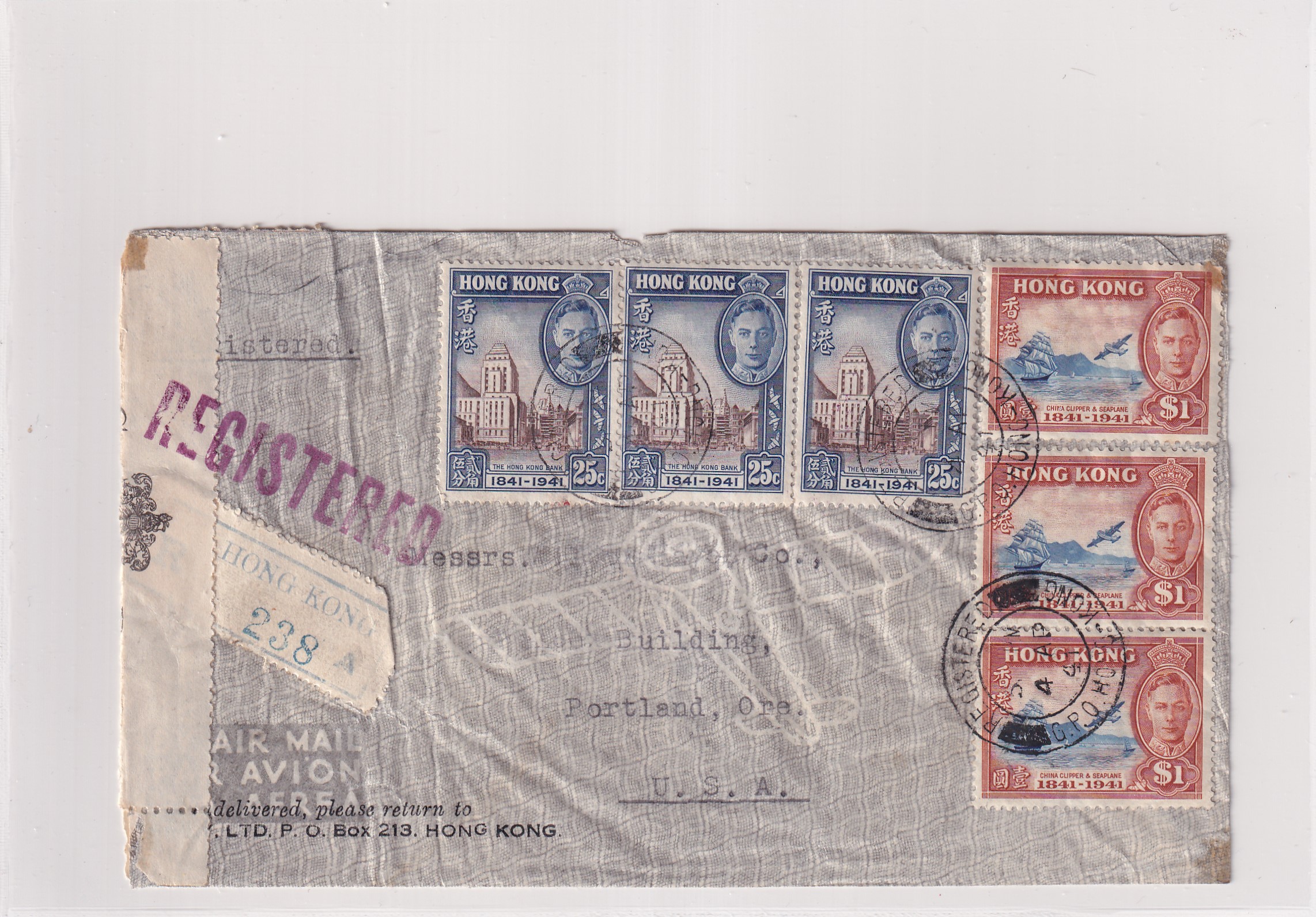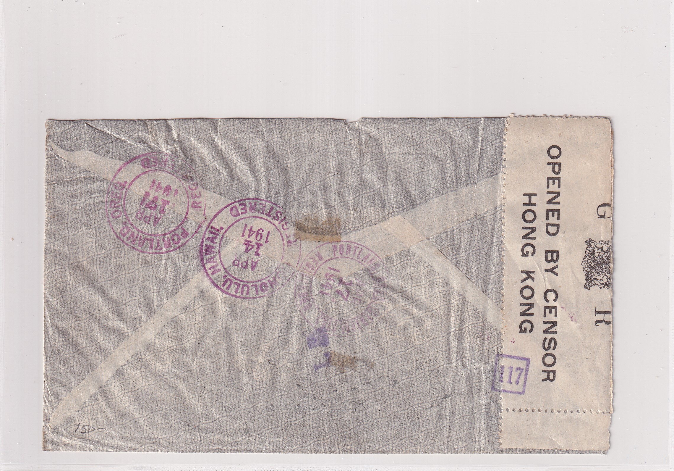 1941 Hong Kong to Portland, Or Registered Trans-Pacific Clipper, HK Censor Tape. back stamped Honolulu & Portland. Added Sunday, January 18, 2026