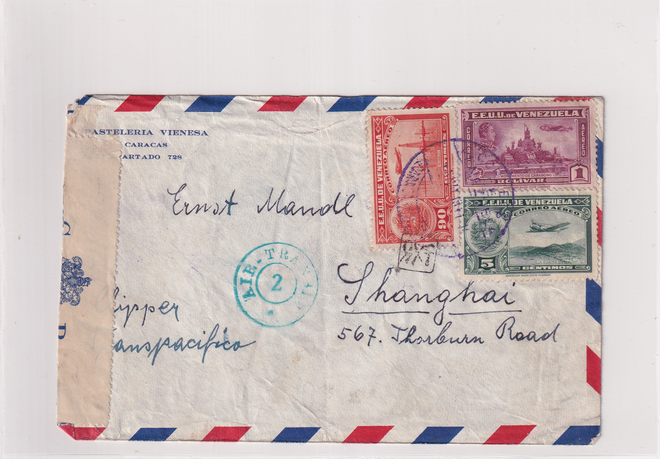 1941 Caracas, Venezuela to Shanghai, China, Trans-Pacific Clipper, Hong Kong Censor & Air-Transit #2 handstamp. back stamped Shanghai. Added Sunday, January 18, 2026