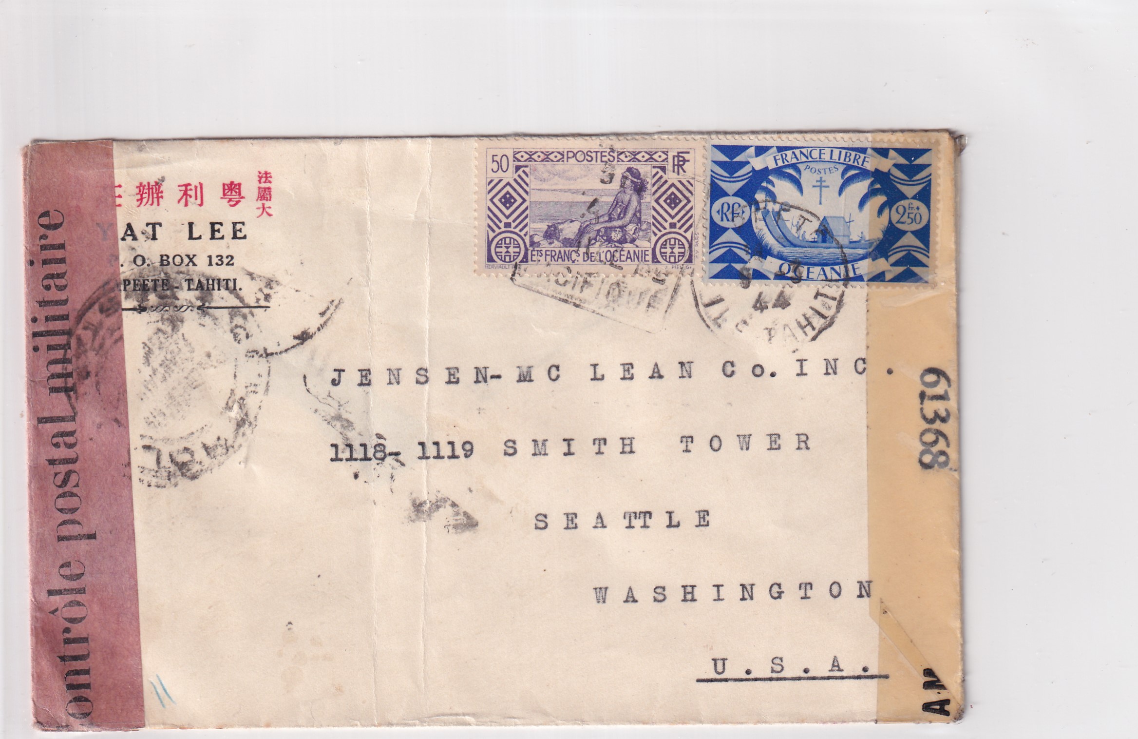 1944 Papeete, Tahiti to Seattle, Wa. French & U.S. Censor tapes. back flap is missing. Added Sunday, January 18, 2026