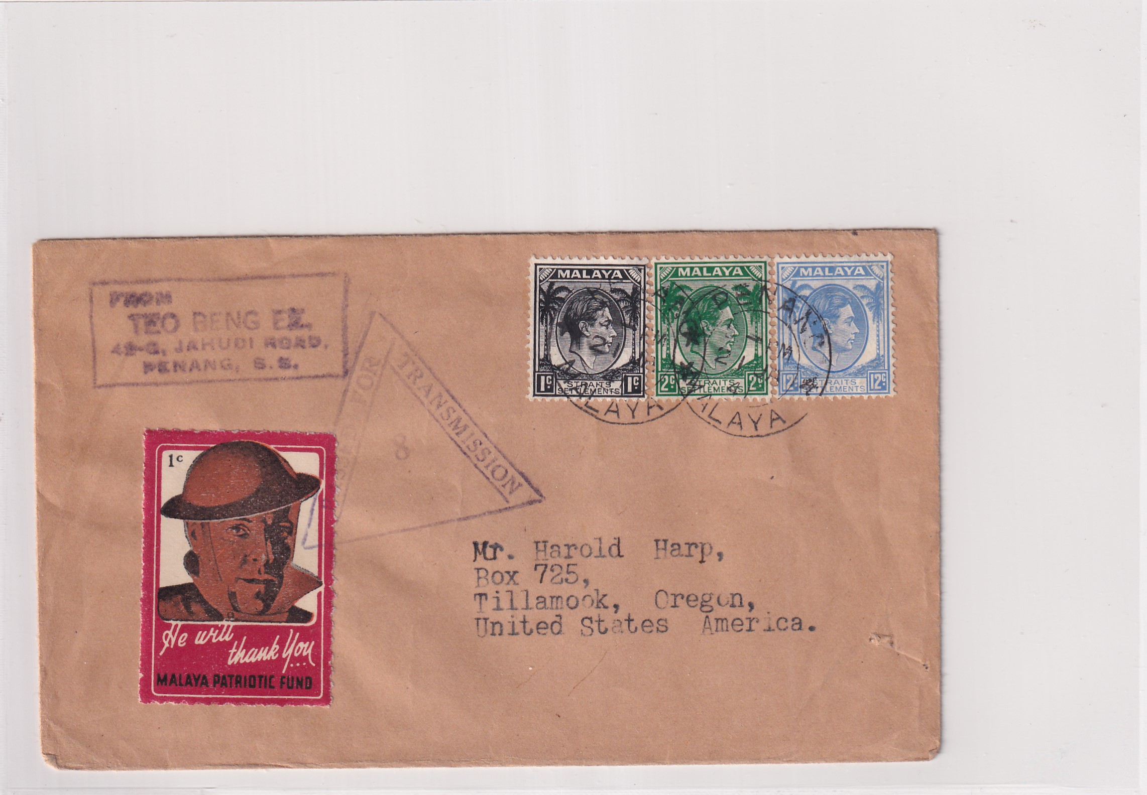 1941 Penang, Malaya to Tillamook, Or Singapore Censor Handstamp. Added Sunday, January 18, 2026