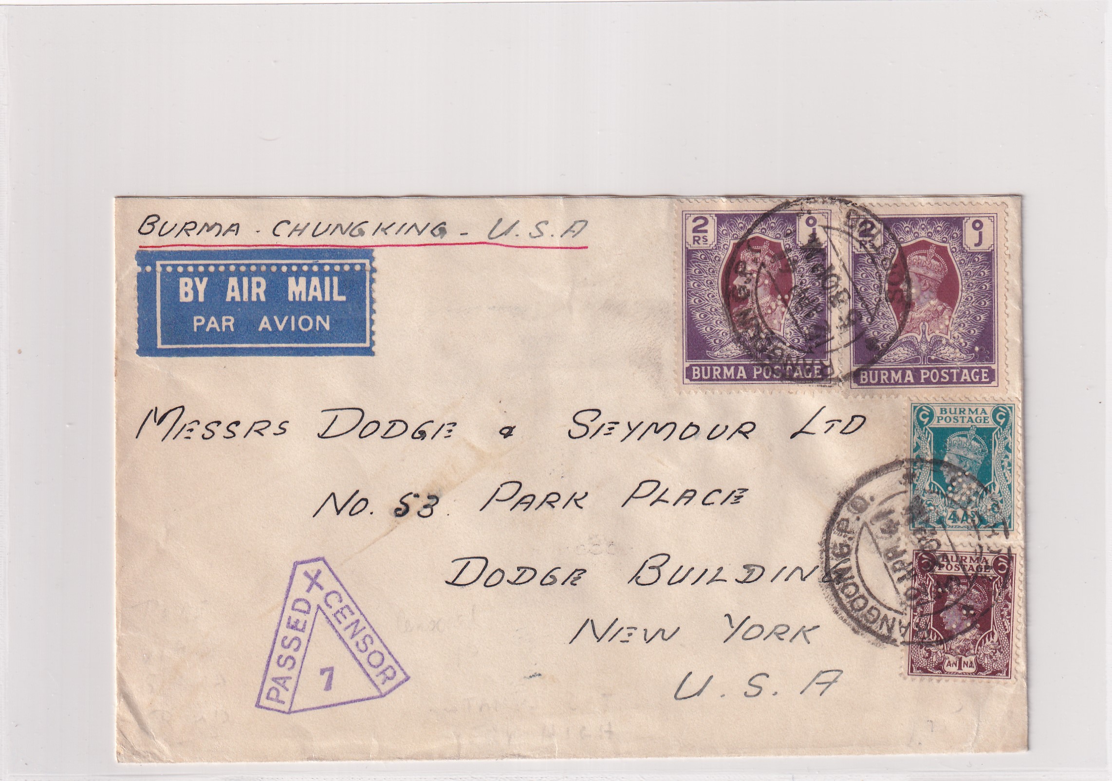 1941 Rangoon, Burma to New York, NY Airmail via Chungking, Burma censor. Added Sunday, January 18, 2026