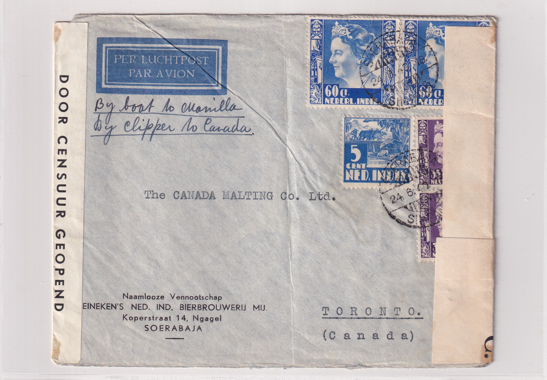 1940 Soerabaja, Dutch East Indies to Toronto, Canada Pacific Clipper Airmail Dutch & Canadian Censors. cover has been folded. No back stamped. Traveled surface to Manila. Added Sunday, January 18, 2026