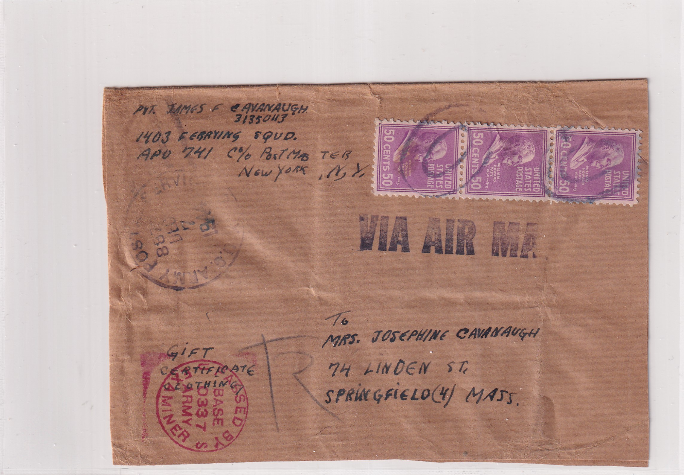 1944 APO 741, New York, NY to Springfield, Ma Airmail Parcel Piece 50c x 3 Prexies, Censored. back stamped APO 887. Added Thursday, January 8, 2026