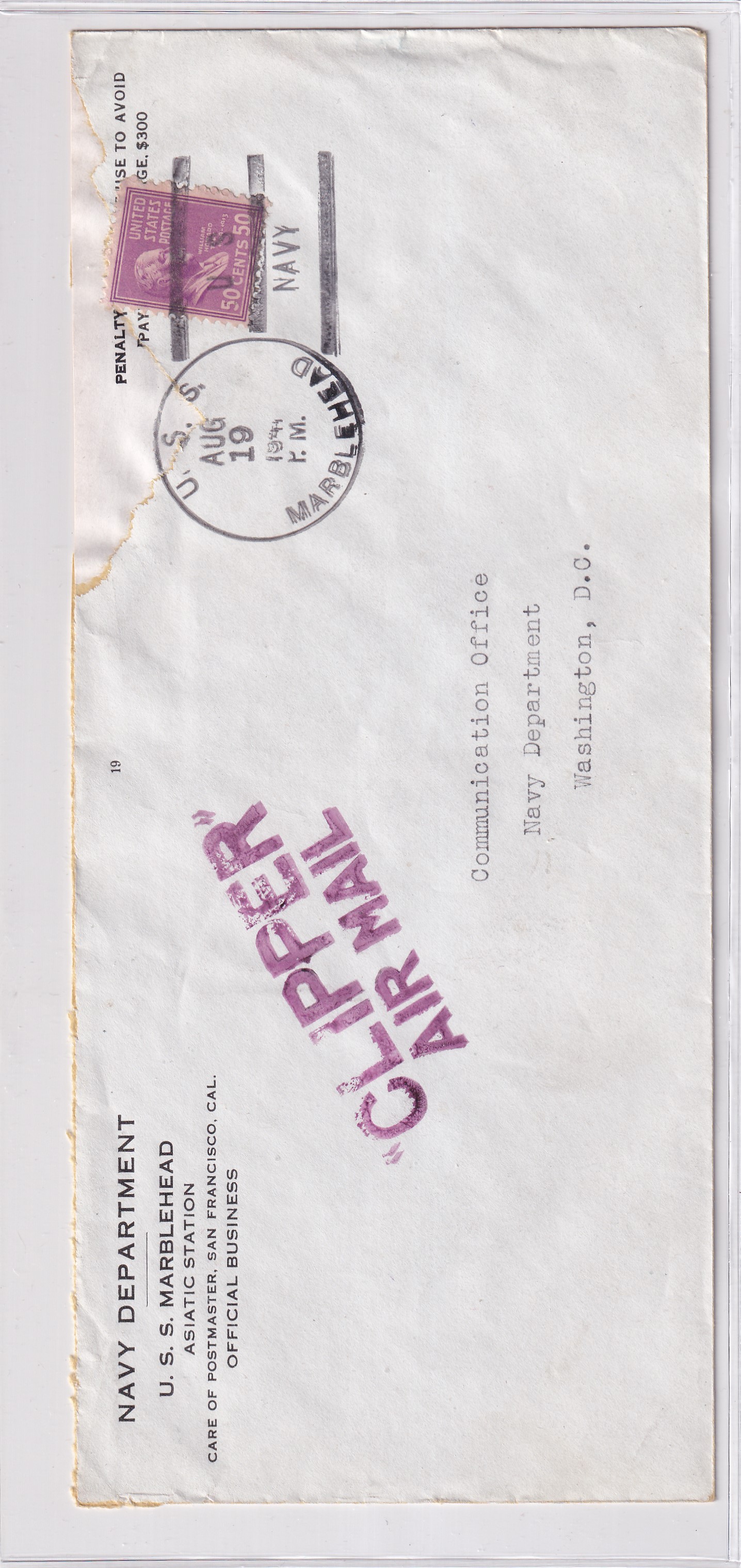 1941 USS Marblehead to Washington DC Clipper Airmail solo 50c Prexie. Cover repaired top right corner. This cover has been repaired at top right corner under stamp. Added Tuesday, January 6, 2026