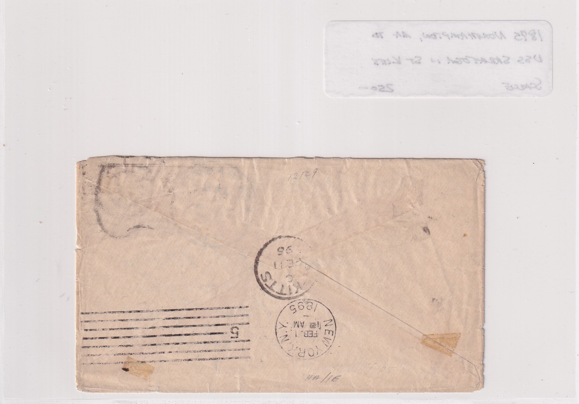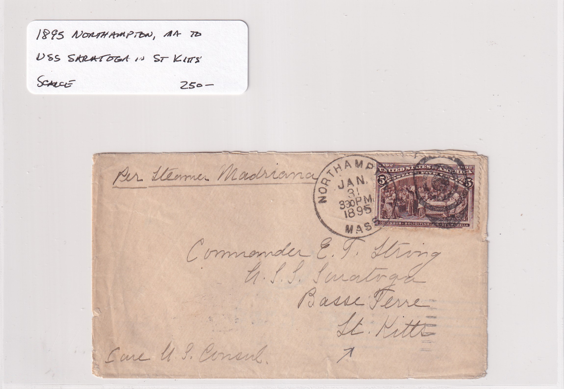 1895 Northampton, Ma to USS Saratoga in St Kitts per Steamer "Madriana" (Scarce). back stamped New York & St Kitts. Added Sunday, January 18, 2026