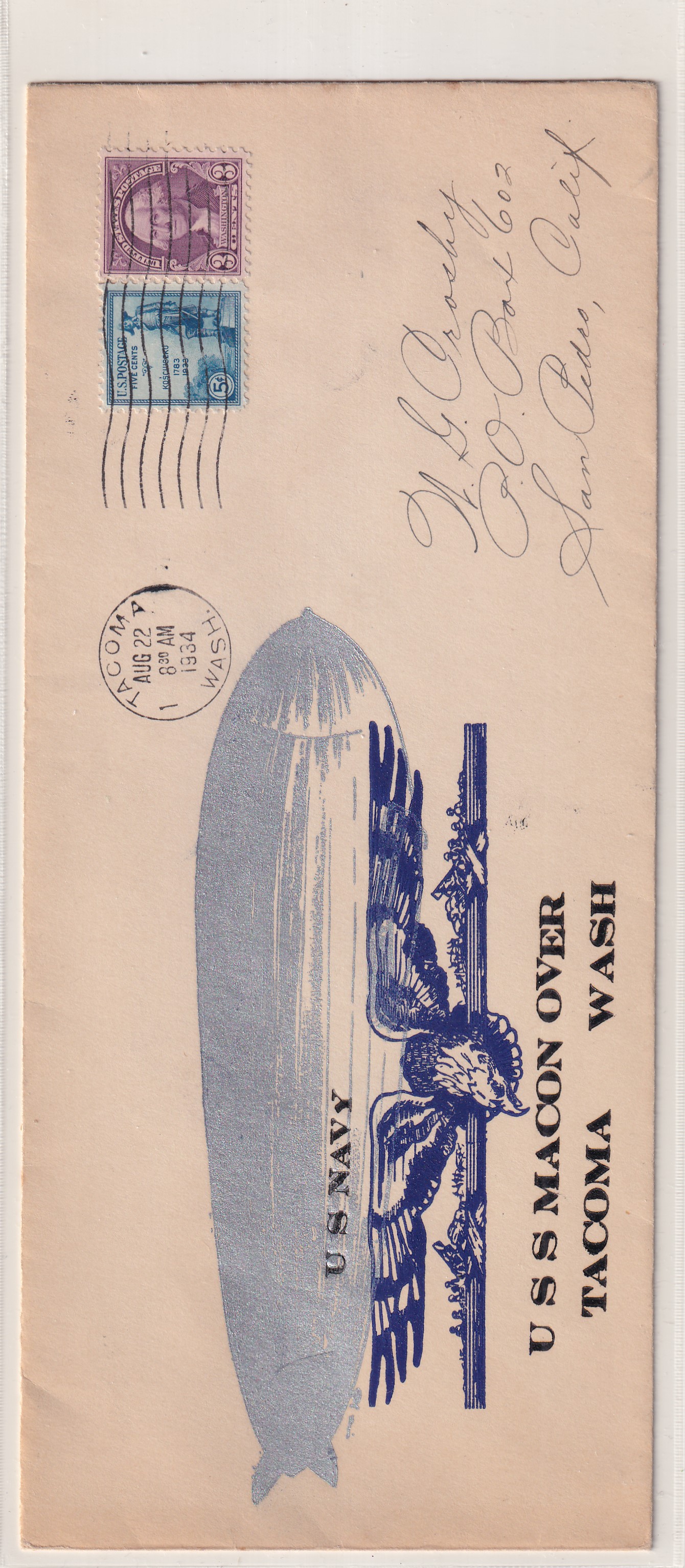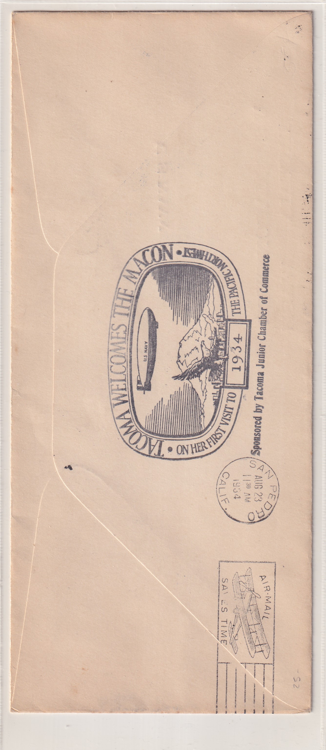 1934 Tacoma, Wa to San Pedro, Ca USS Macon Over Tacoma, Washington. #10. back stamped San Pedro. Tacoma Junior Chamber of Commerce cachet. Added Sunday, January 18, 2026