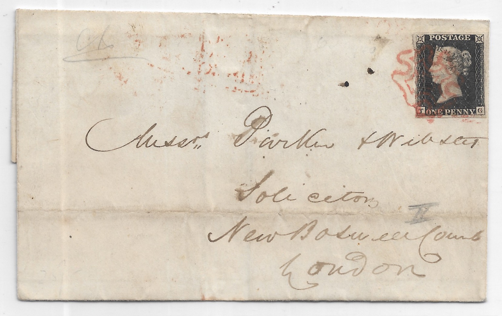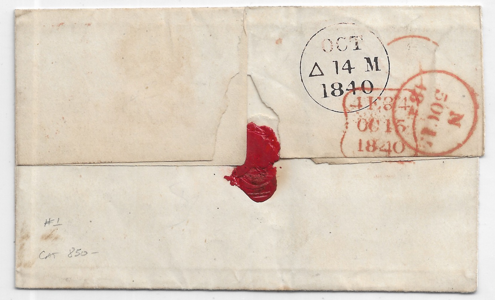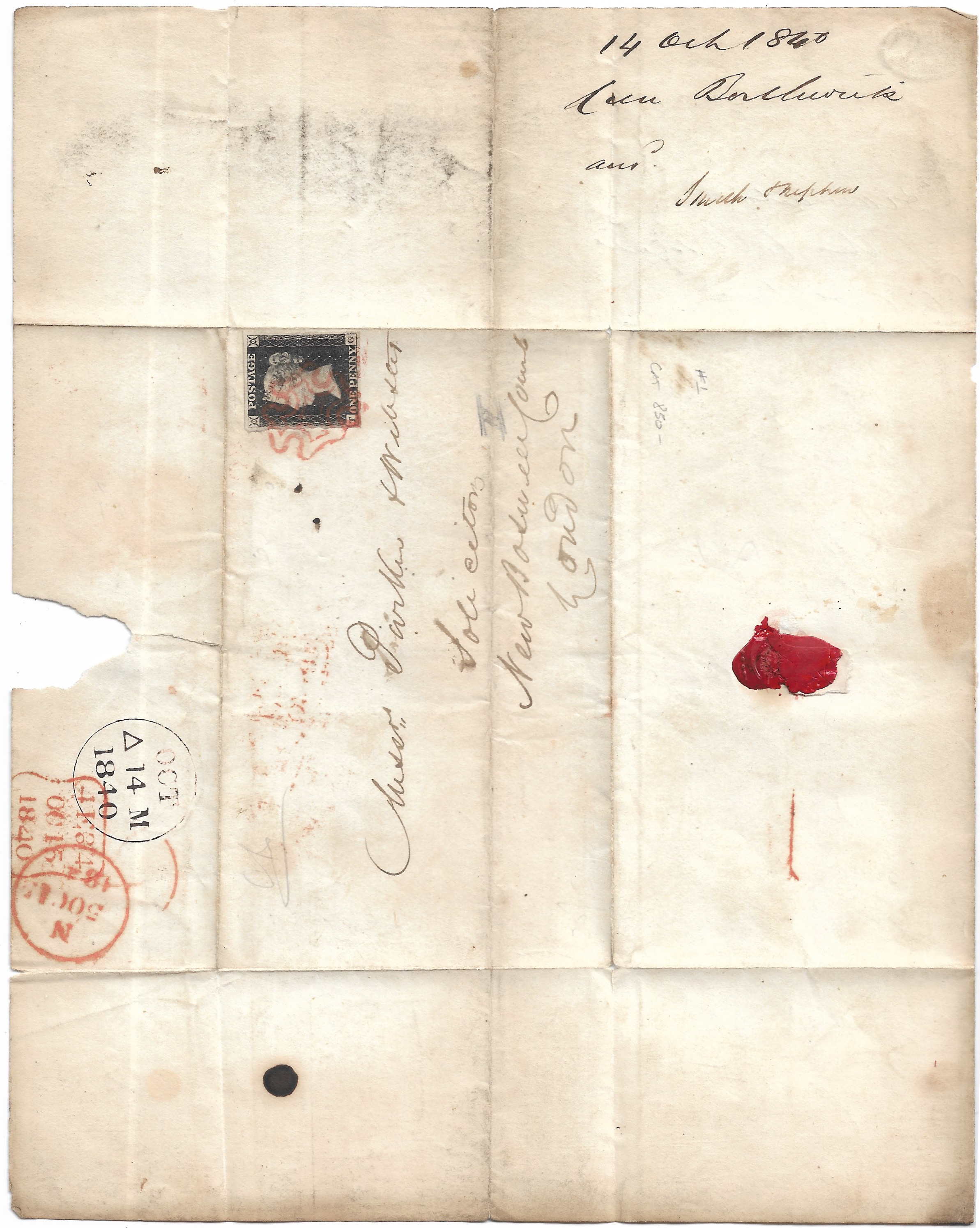 1840 London to London, England Sc # GB #1 on cover w/red Maltese canx. back stamped 14 Oct 1840. Added Sunday, September 14, 2025