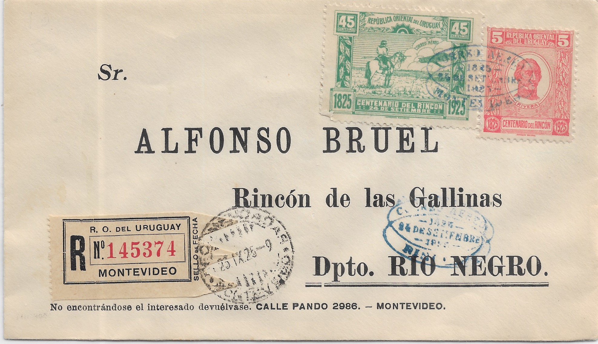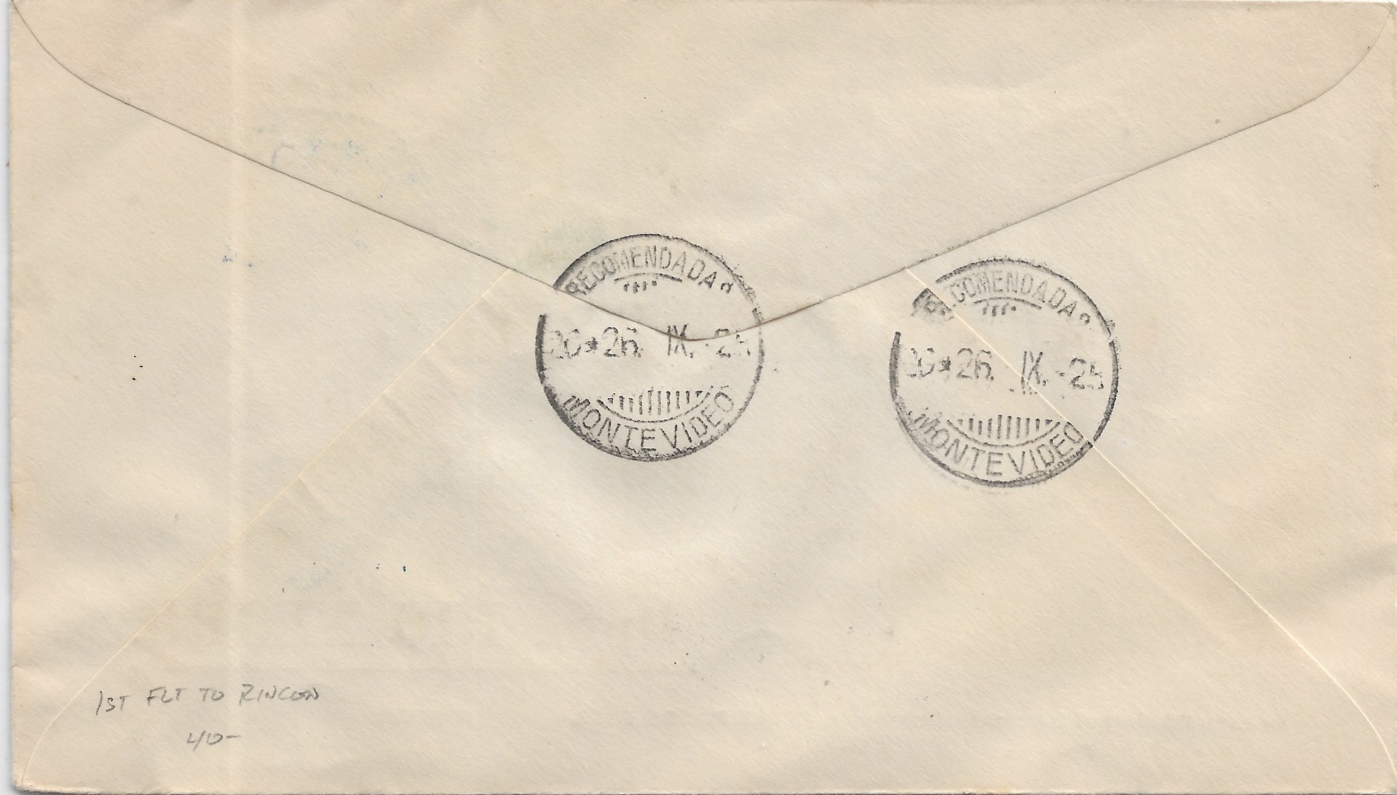 1925 1st Flight Montevideo to Rincon, Uruguay. Back stamped Montevideo. Added Sunday, September 14, 2025