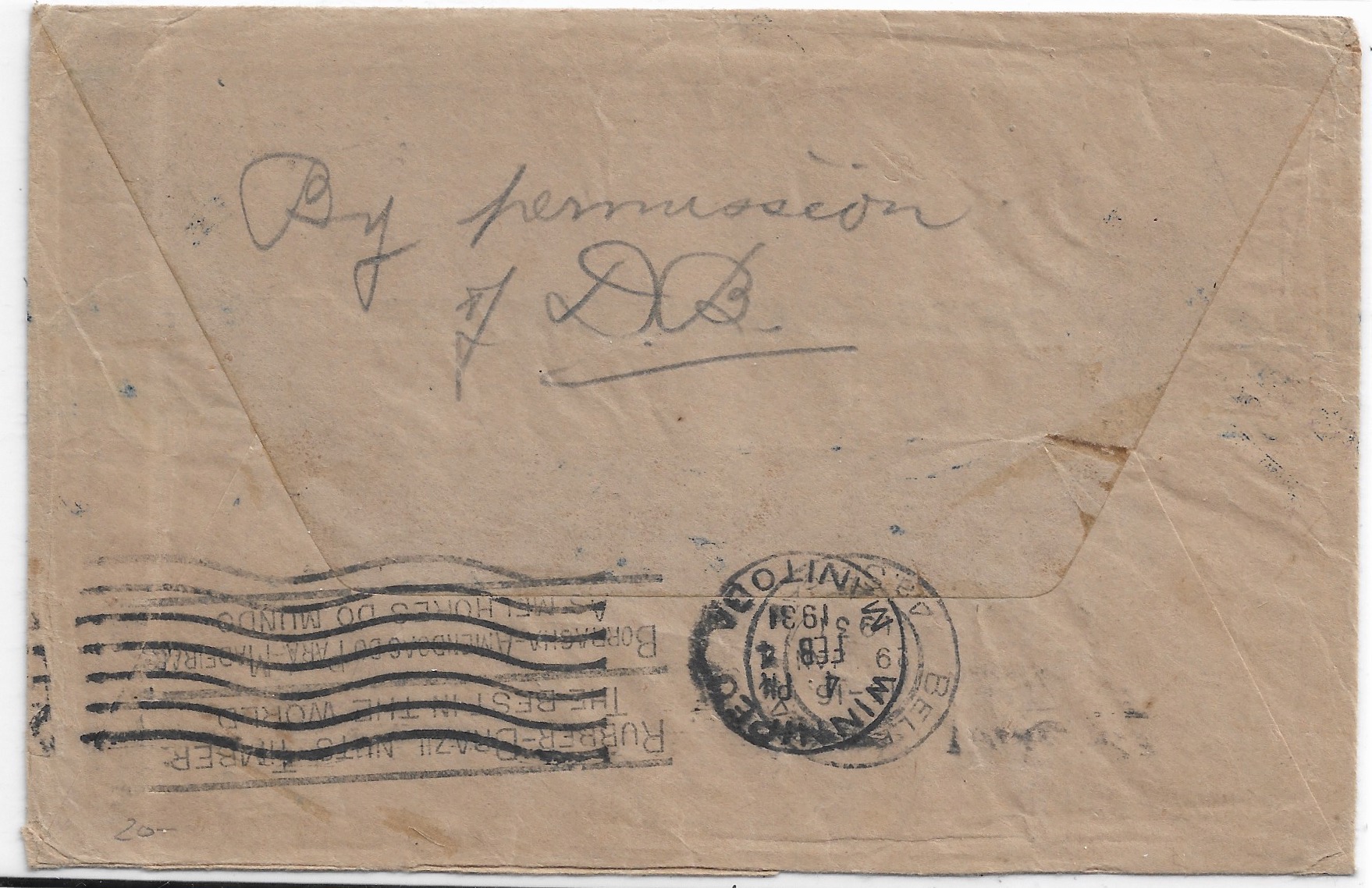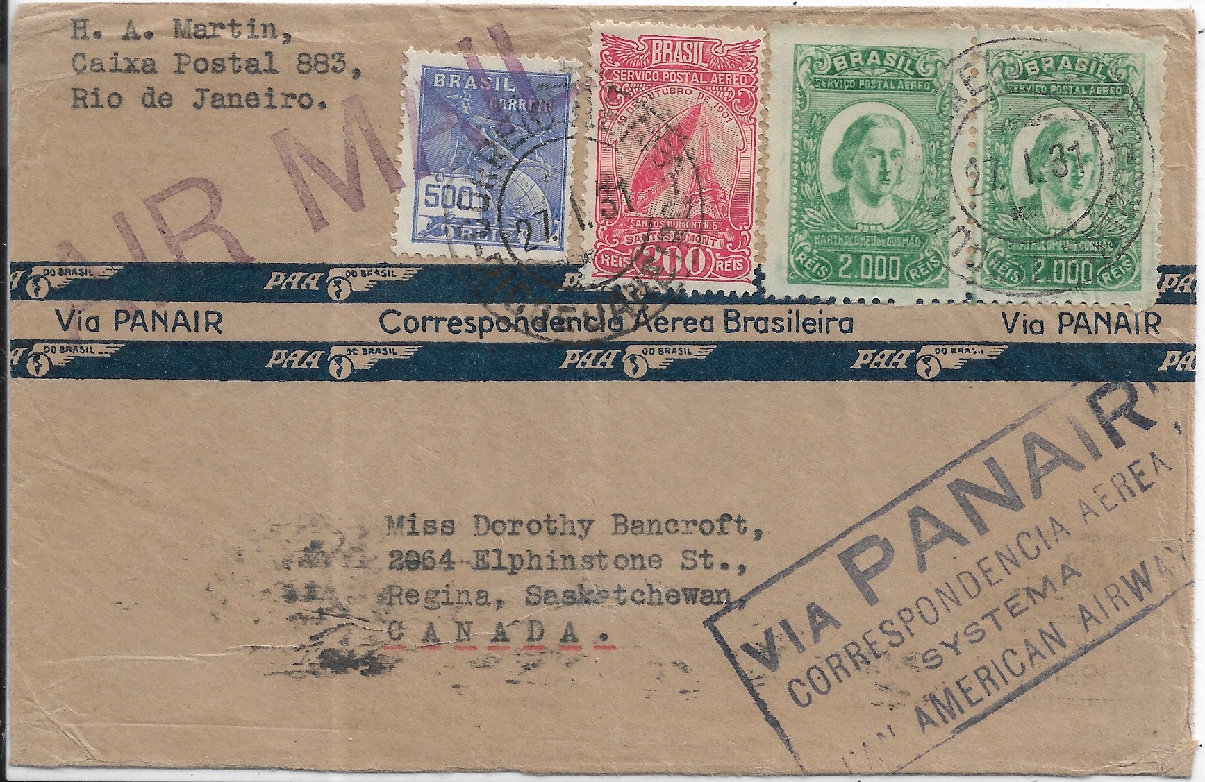 1931 Rio de Janeiro, Brazil to Regina, Canada via PANAIR. back stamped Winnipeg. Added Wednesday, September 17, 2025