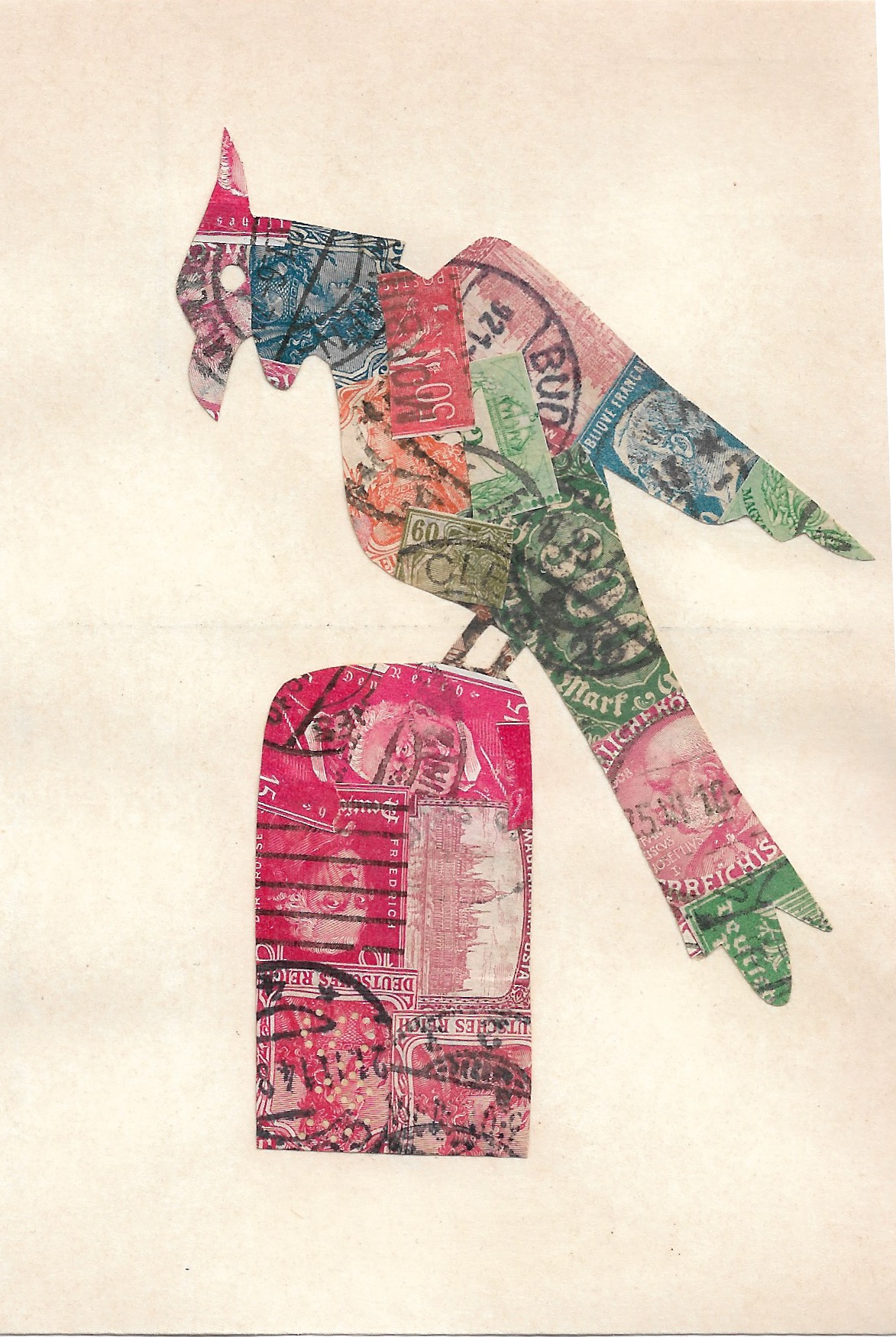 Stamp Art: Bird on a Stand, made from Cut-up Stamps. Added Wednesday, October 8, 2025