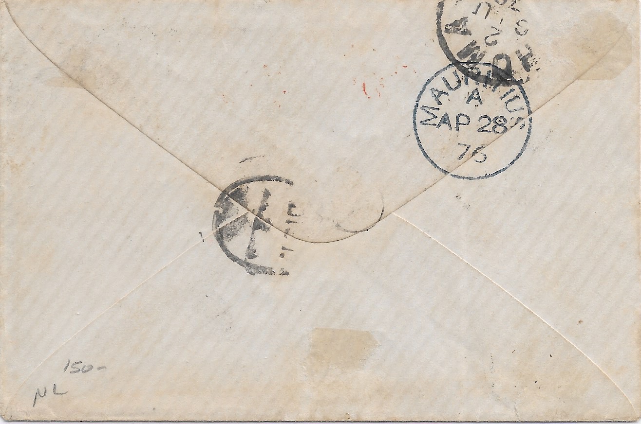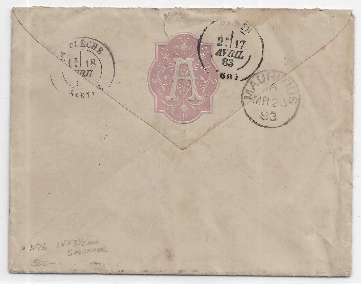1883 Mauritius to La Fliche, France via Suez solo Sc #76. back stamped Mauritius, Paris & La Flieche. Added Sunday, October 12, 2025