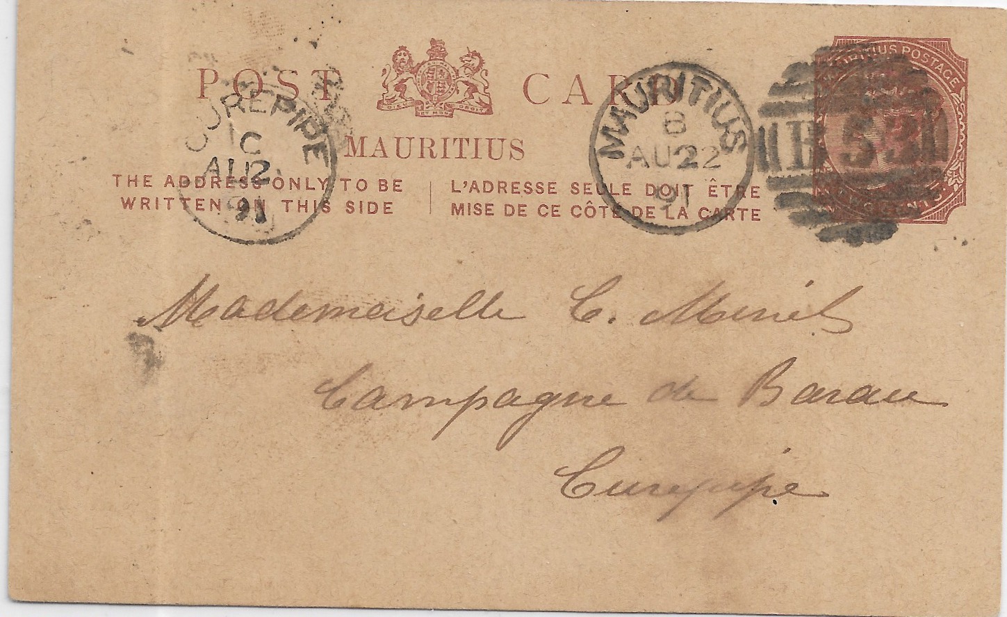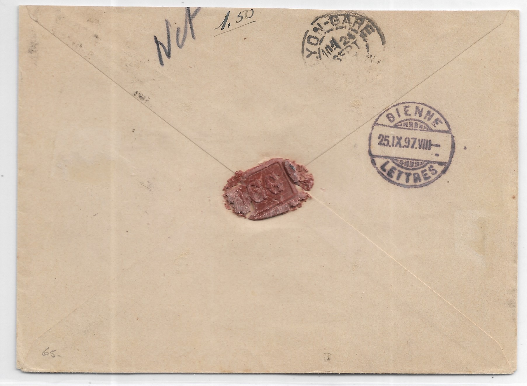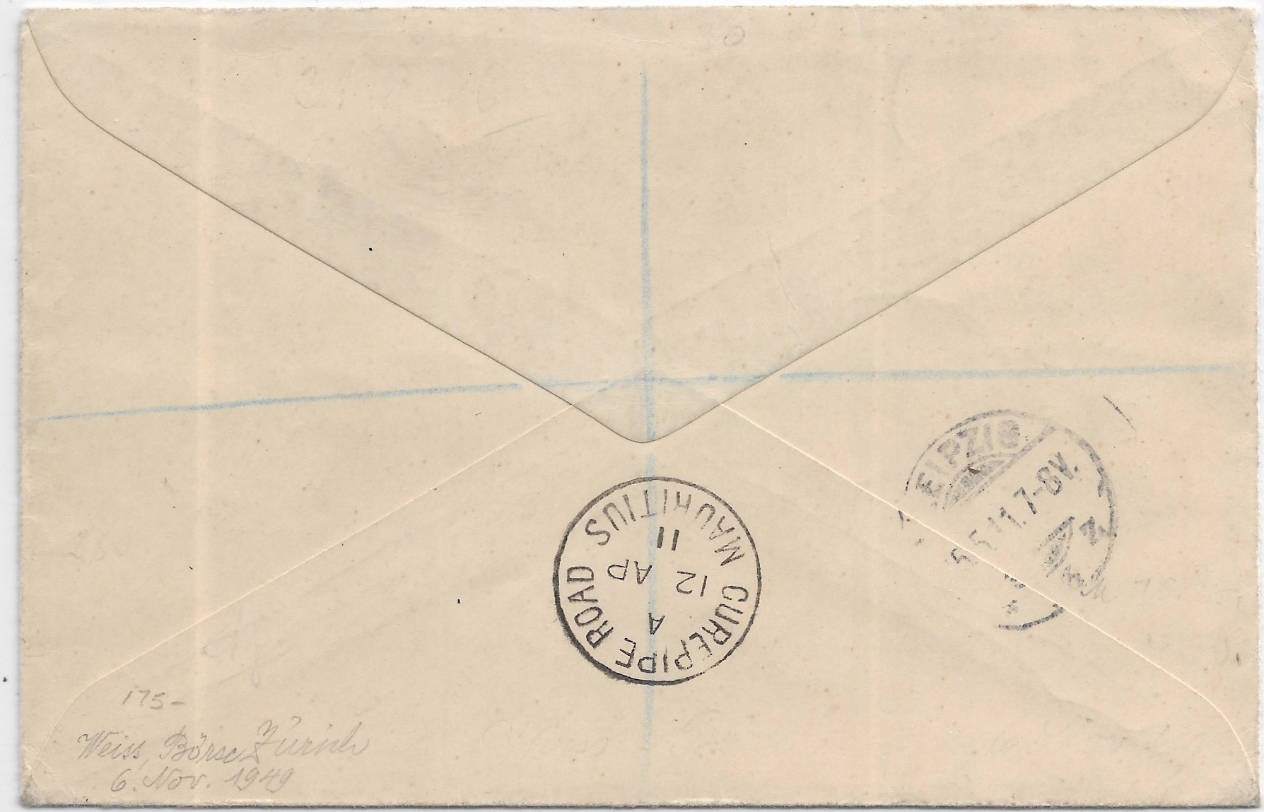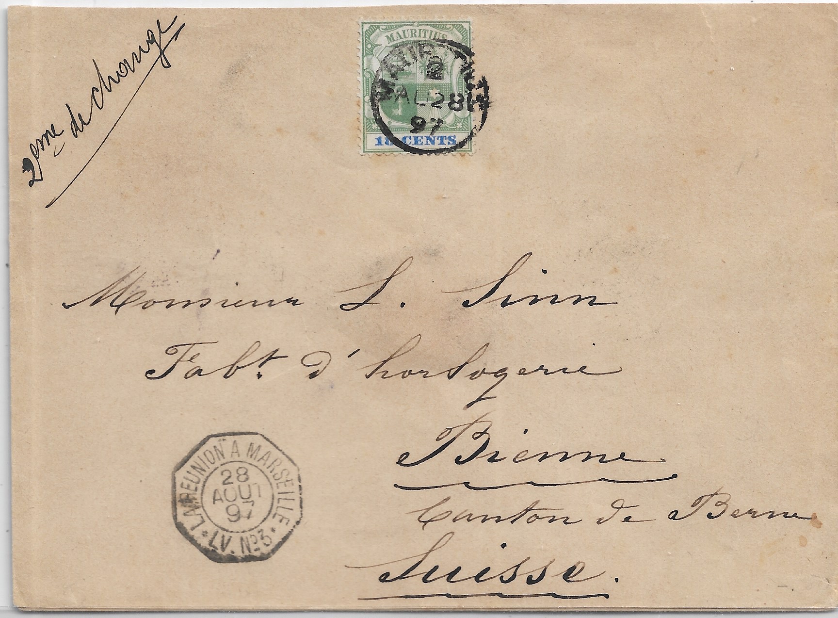 1897 Mauritius to Bienne, Switzerland. back stamped Lyon-Gare & Bienne. Added Sunday, October 12, 2025