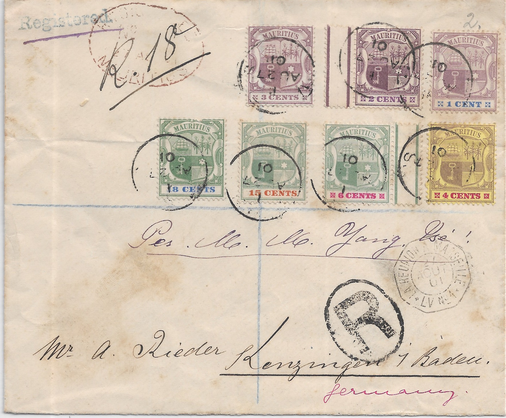 1901 Mauritius to Kenzingen, Germany Registered. back stamped Kenzingen. Added Sunday, October 12, 2025