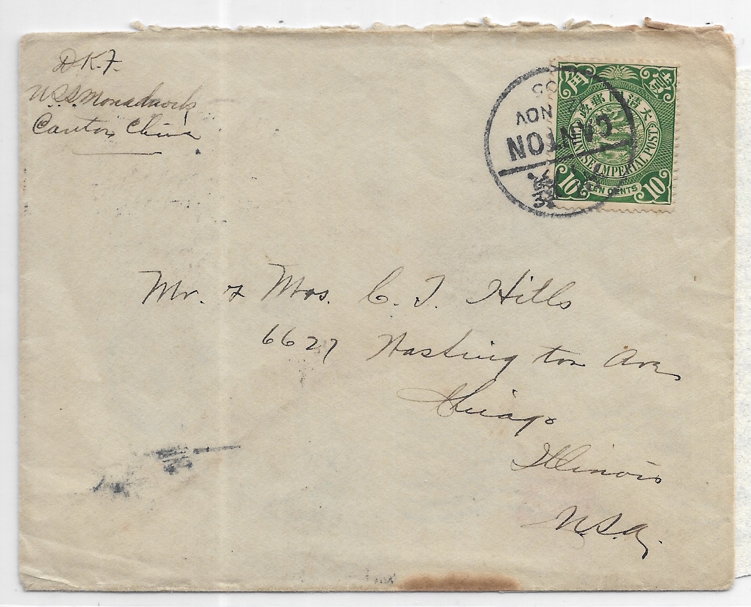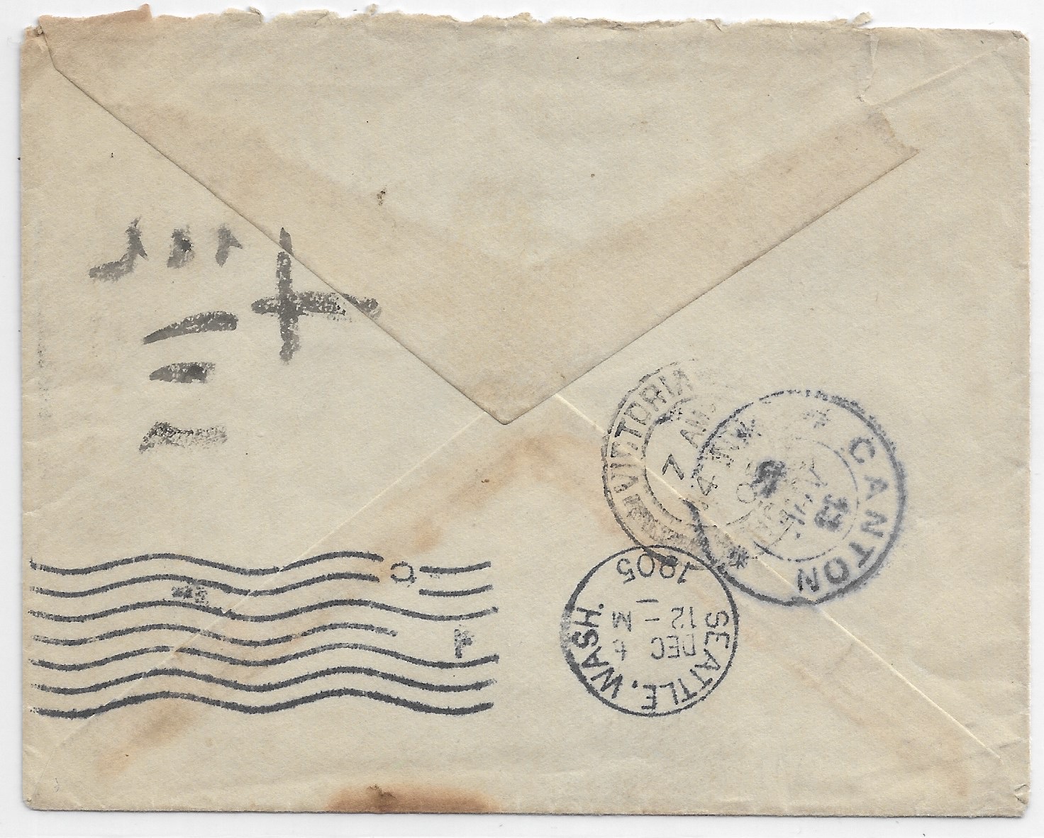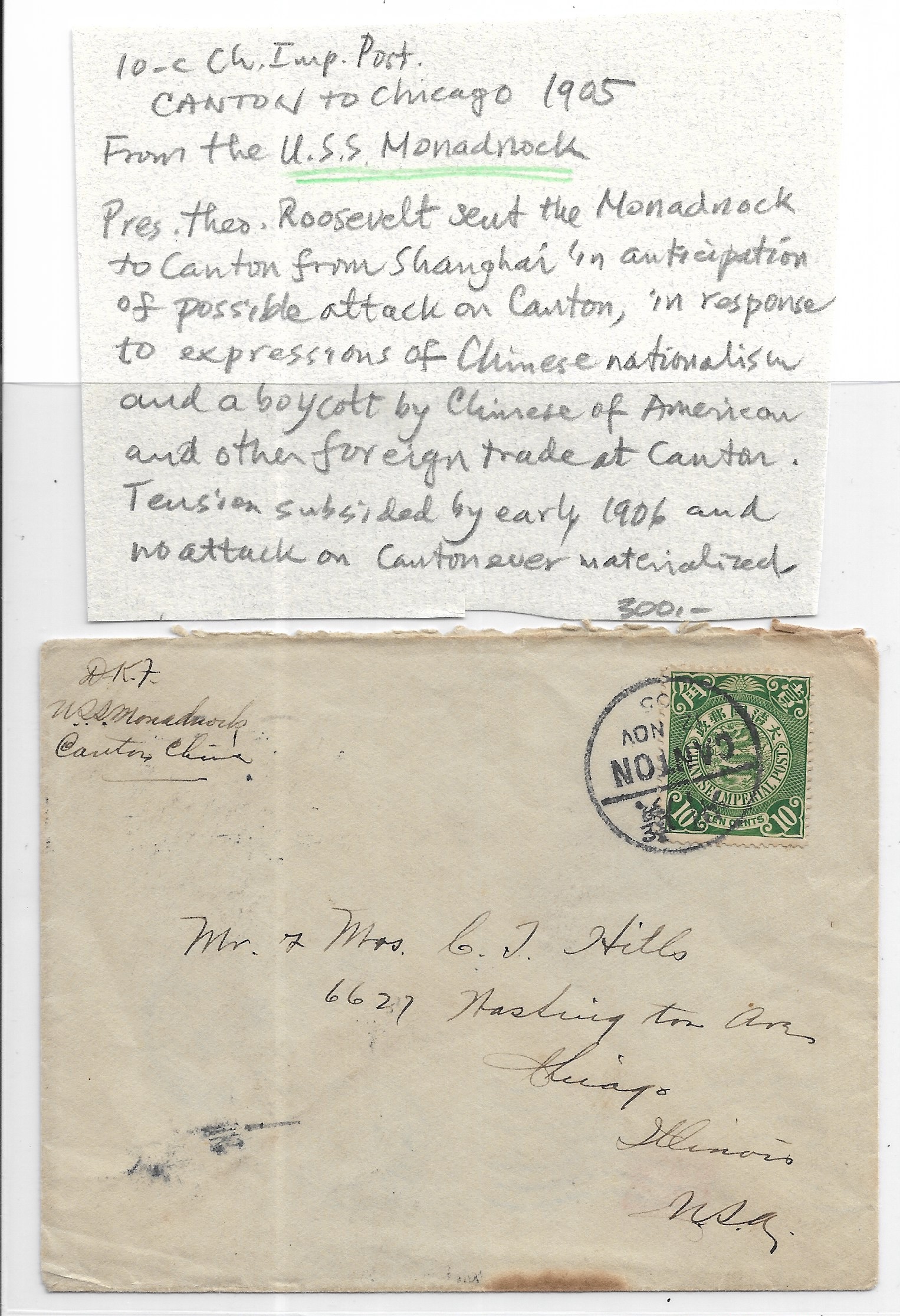 1905 USS Monadnock, Canton, China to Chicago, IL. back stamped Canton, Victoria & Seattle. In 1905 Pres Roosevelt sent the USS Monadnock to Canton from Shanghai in anticipation of a possible attach on Canton. Added Sunday, October 12, 2025