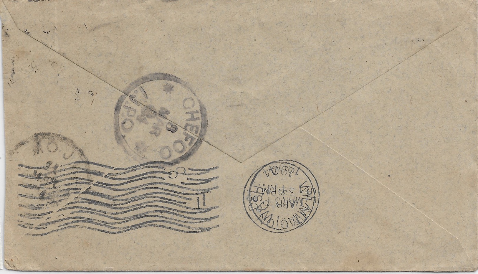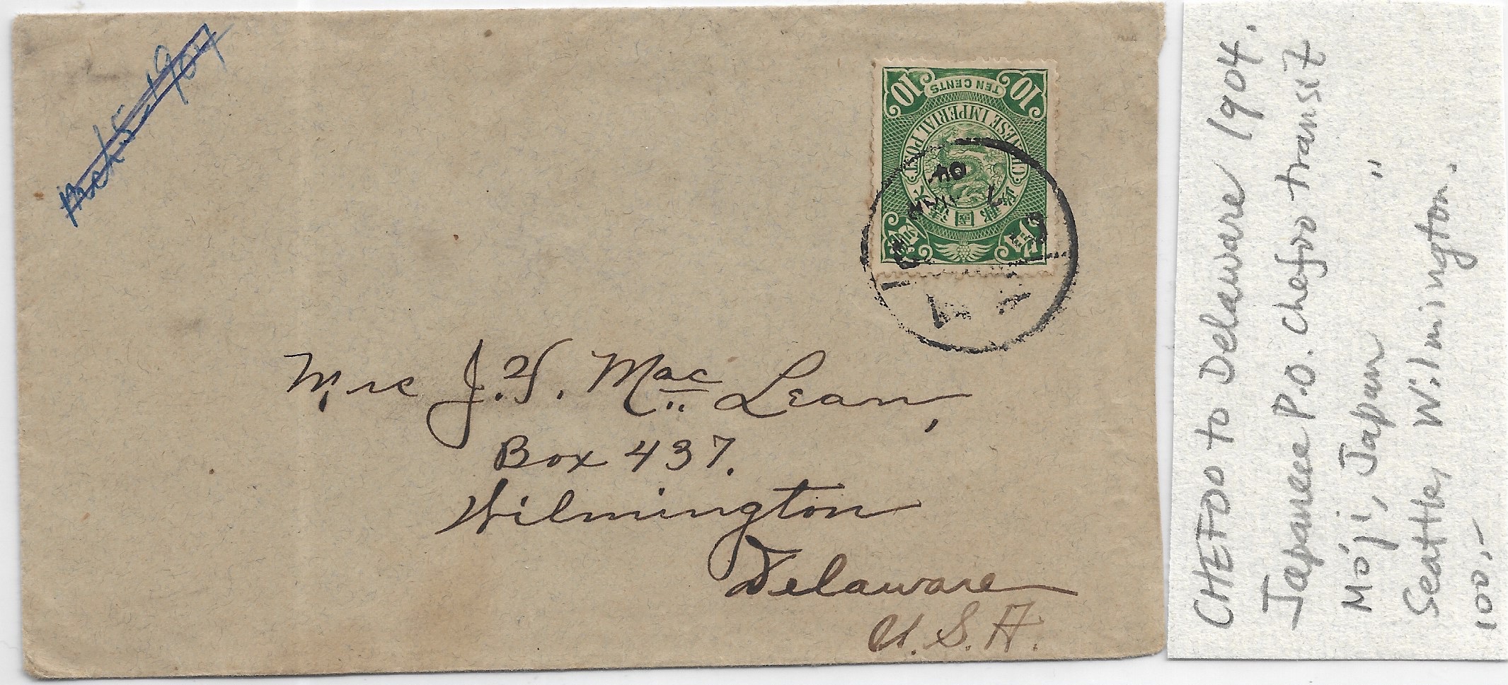 1904 Chefoo, China to Wilmington, DE. back stamped I.J.P.O. Chefoo, Moji, Seattle & Wilmington. Added Sunday, October 12, 2025