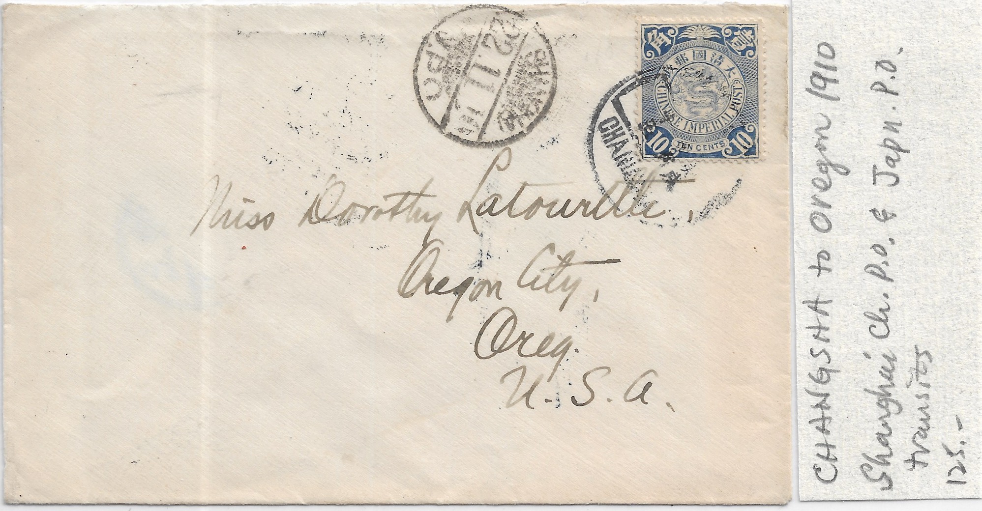 1910 Changsha, China to Oregon City, Or. back stamped Shanghai & I.J.P.O. Shanghai. Added Sunday, October 12, 2025