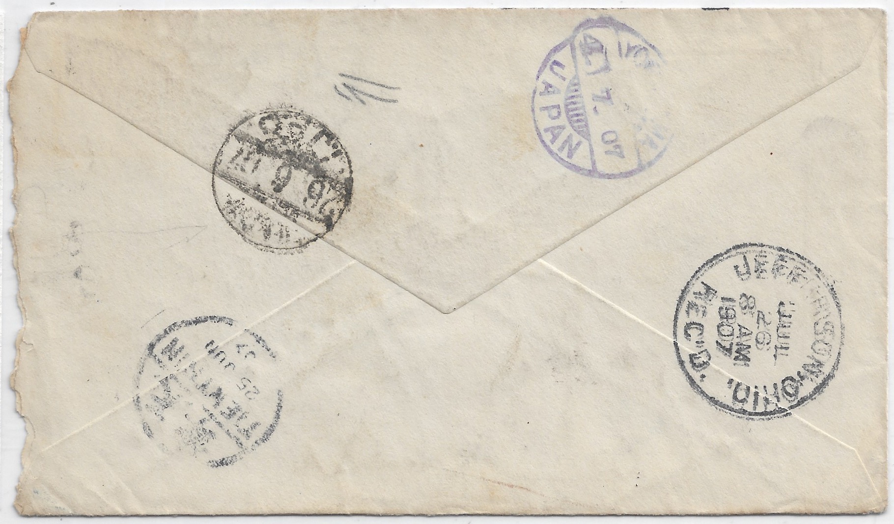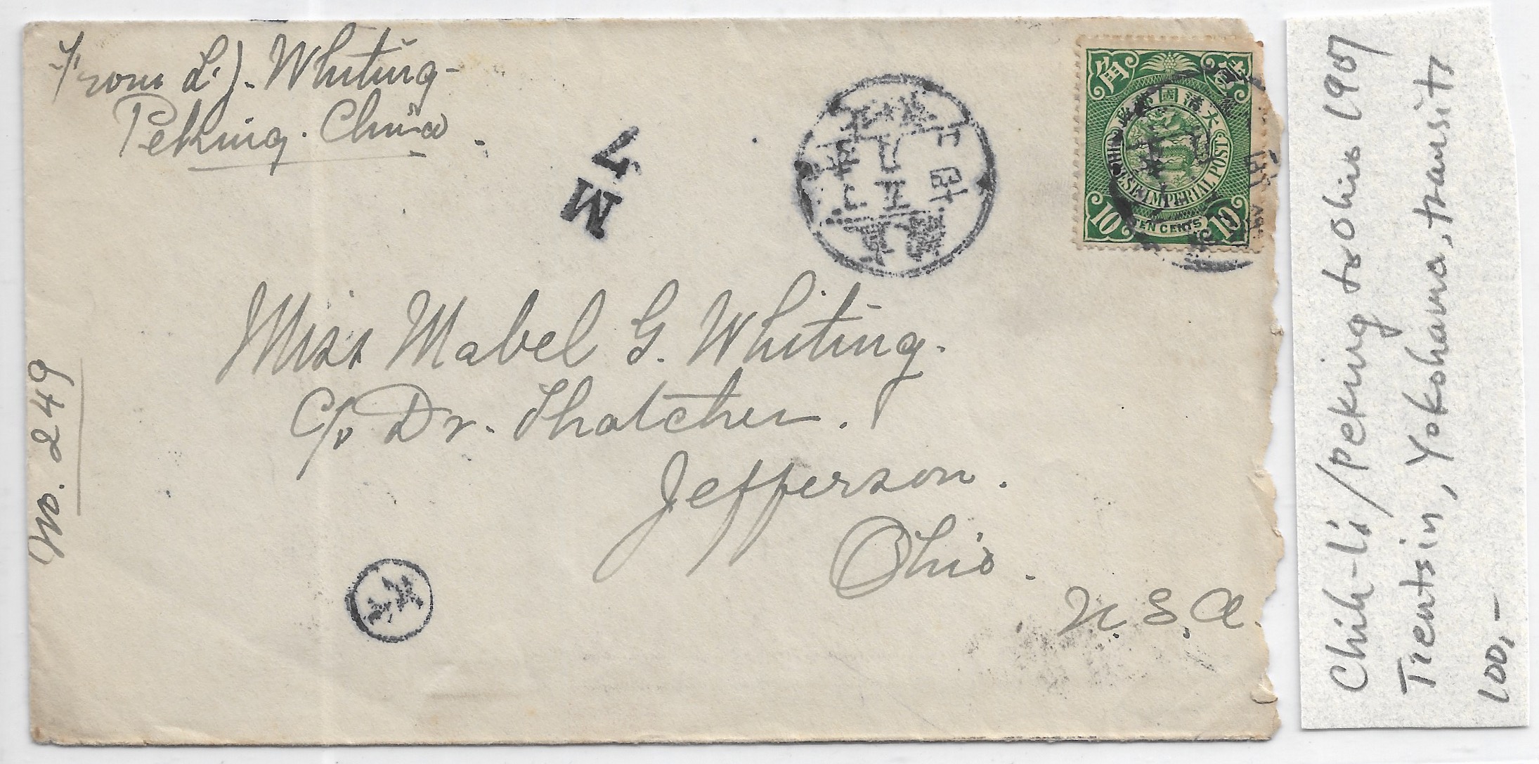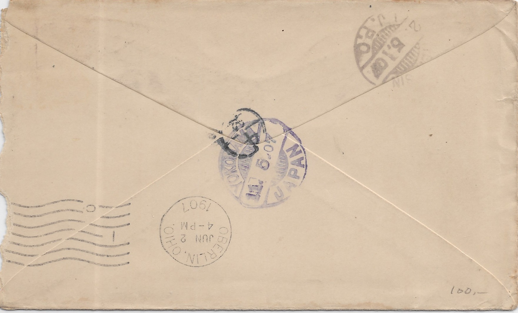 1907 Peking, China to Oberlin, OH via Yokohama. back stamped I.J.P.O. Shanghai, Yokohama, & Oberlin. Added Sunday, October 12, 2025