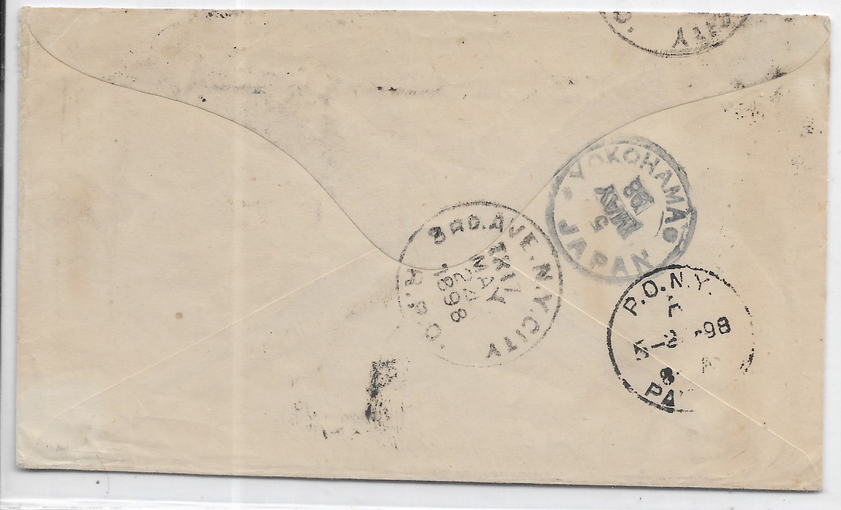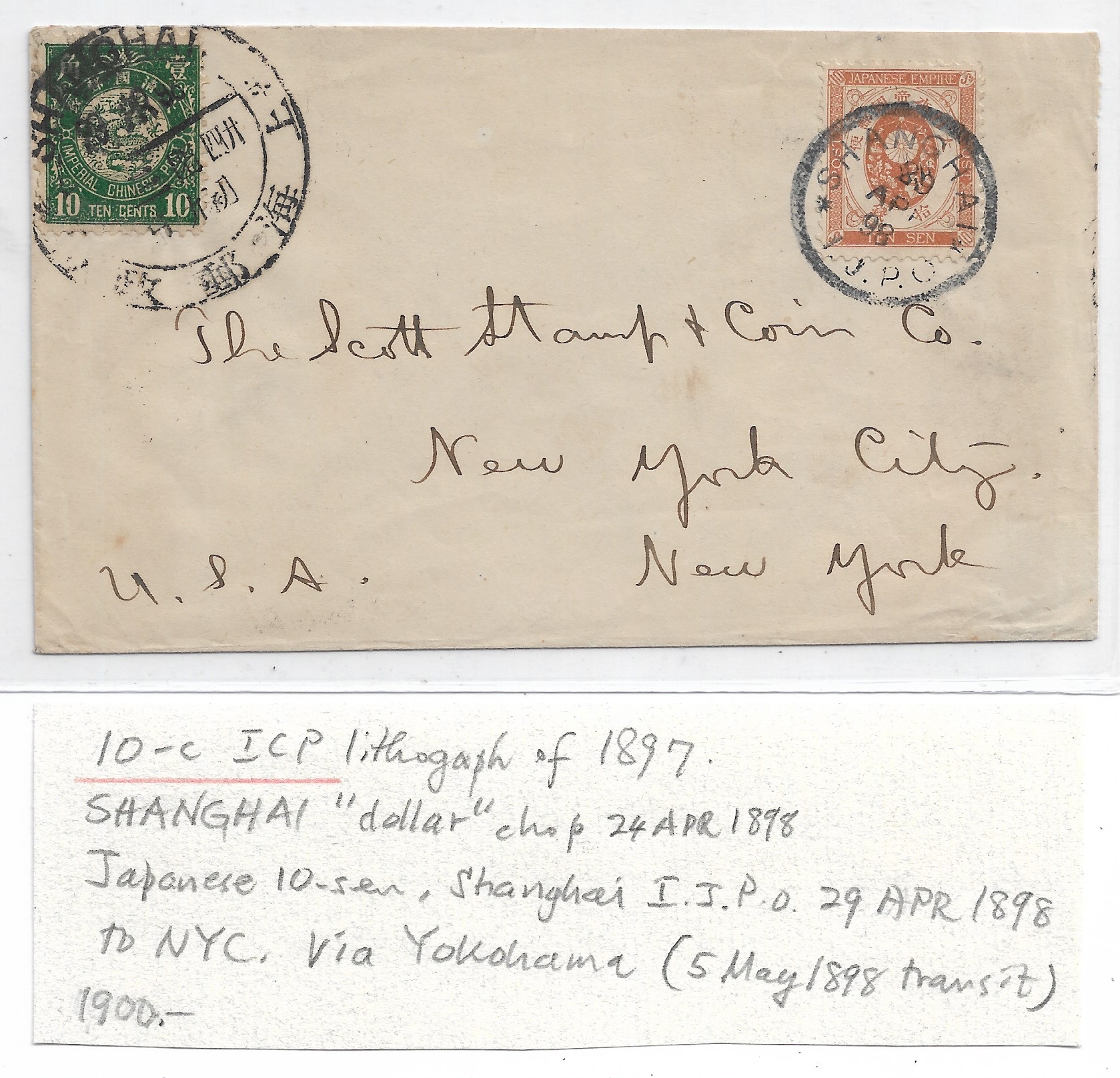 1898 I.J.P.O. Shanghai, China to New York, NY 10c ICP Lithograph of 1897 Shanghai "Dollar" chop. back stamped Yokohama, & New York. Added Sunday, October 12, 2025