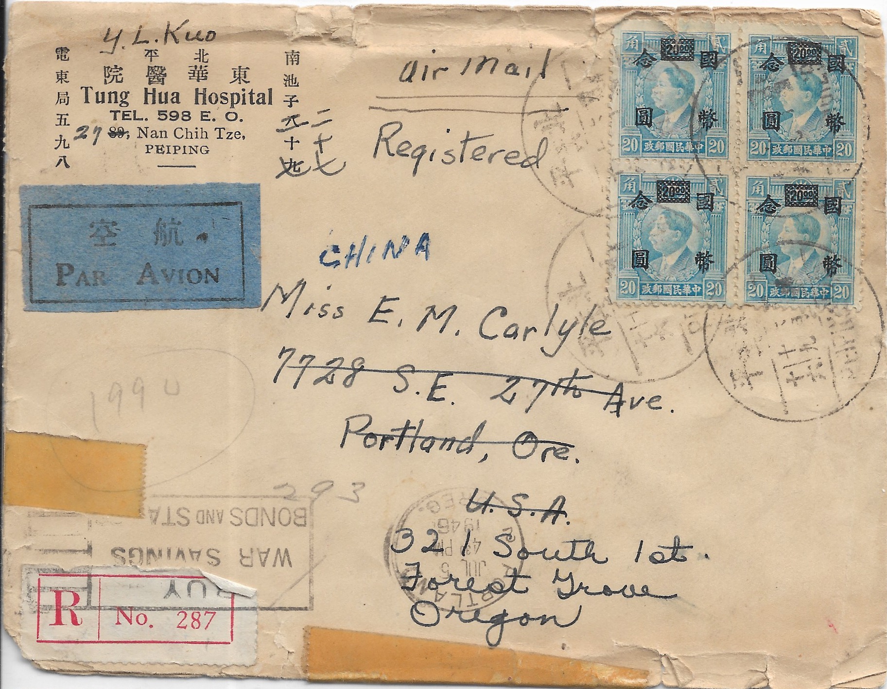 1946 Peiping, China to Portland, Or Registered Airmail fwd to Forest Grove. back stamped Peiping & Portland. Added Sunday, October 12, 2025