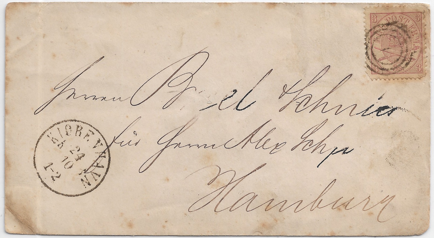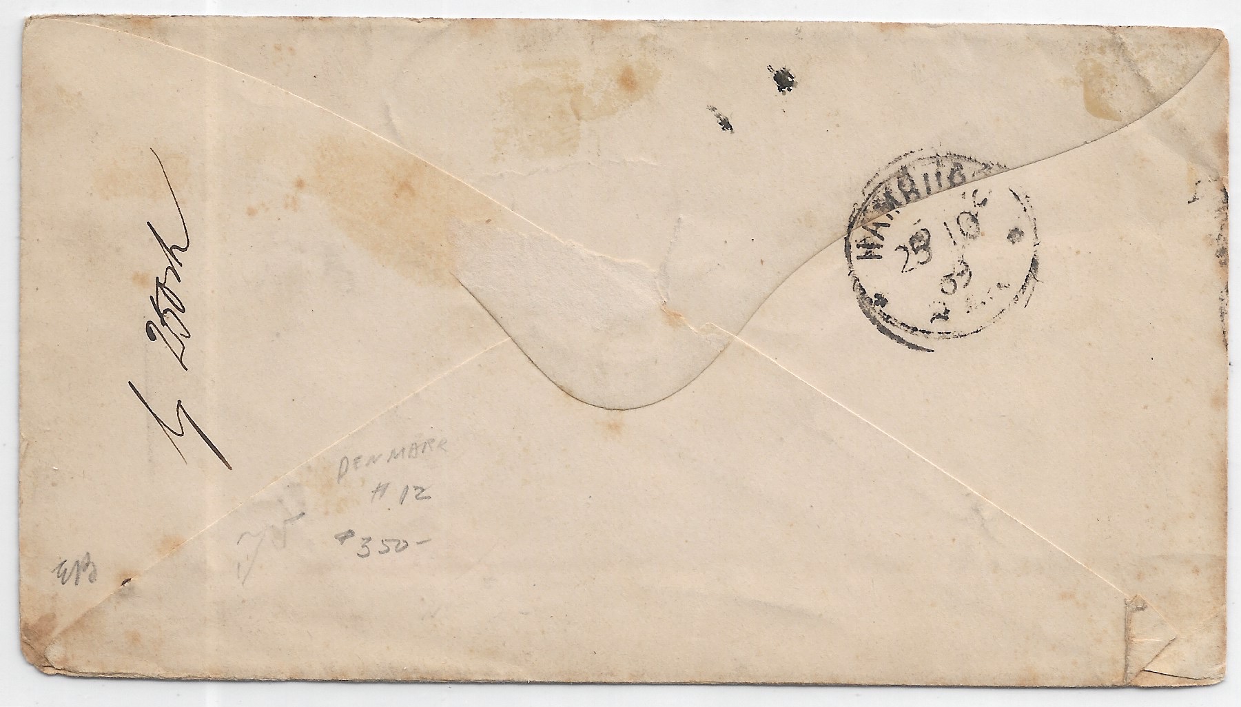 1869 Copenhagen, Denmark to Hamburg, Germany solo Sc #12. back stamped Hamburg. Added Tuesday, October 14, 2025