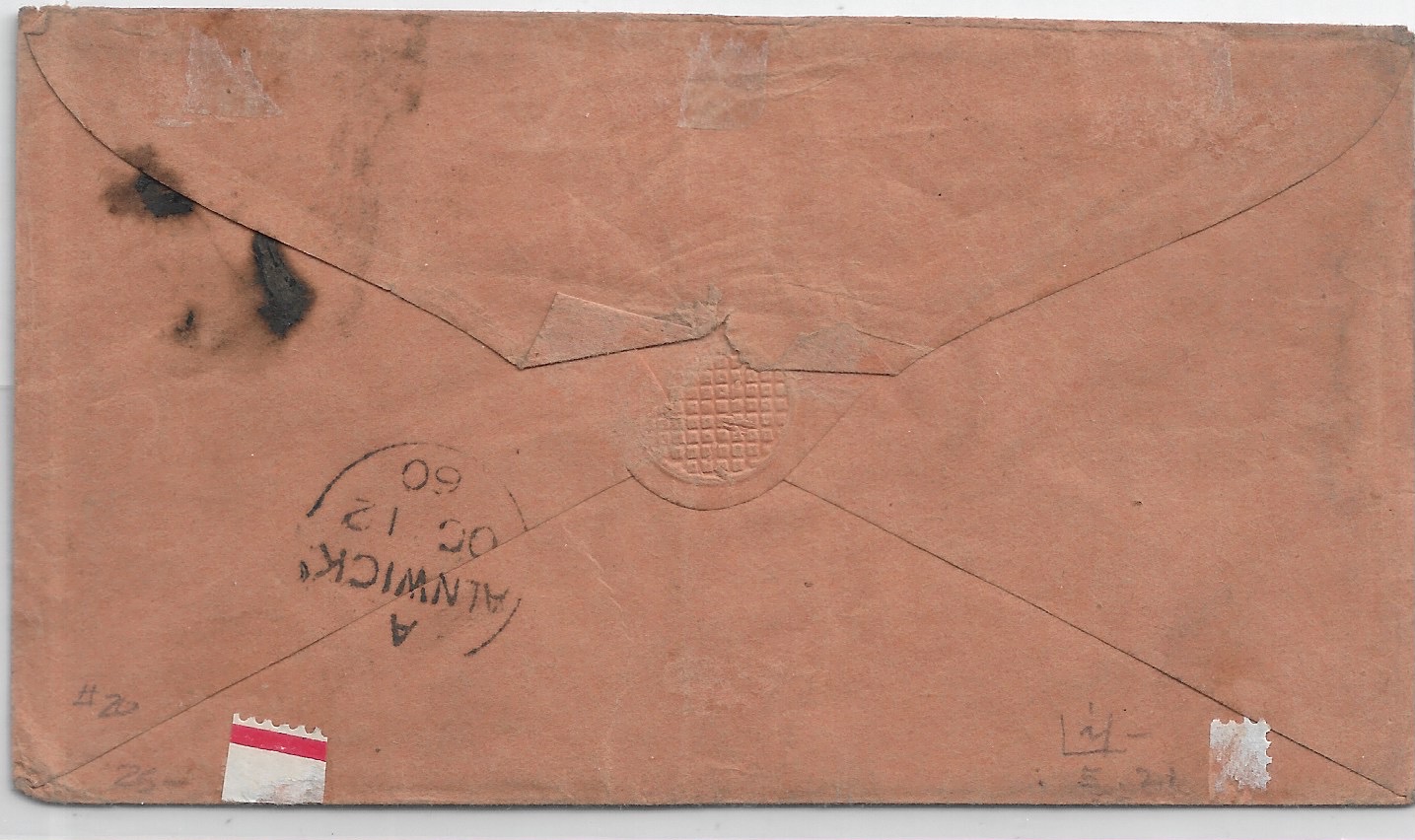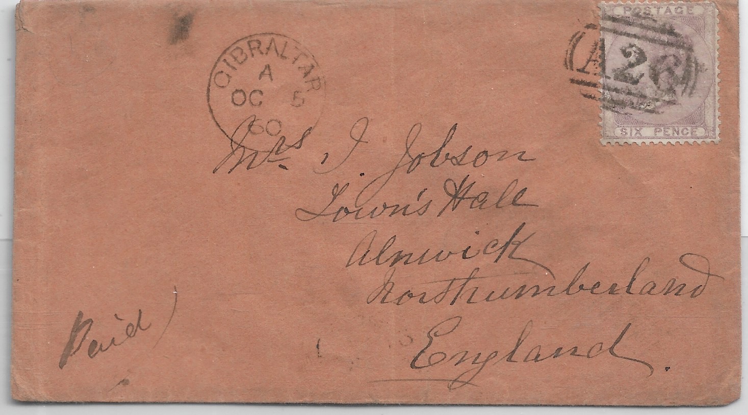 1860 Gibraltar to Alnwick, England solo Sc #20. back stamped Alnwick. Added Tuesday, October 14, 2025