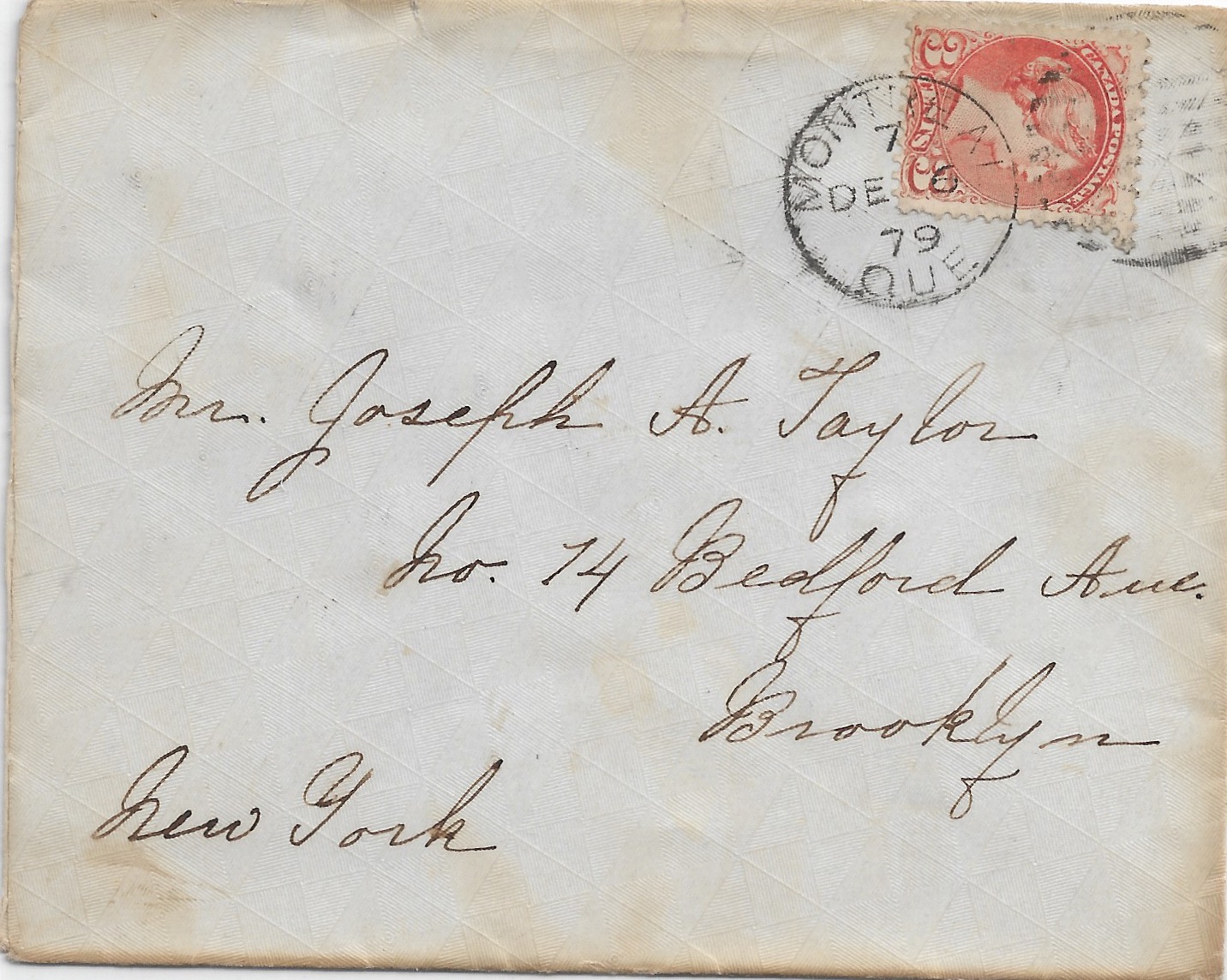 1879 Montreal, Canada to Brooklyn, NY solo 3c Small Queen. back stamped Brooklyn. Added Tuesday, October 14, 2025