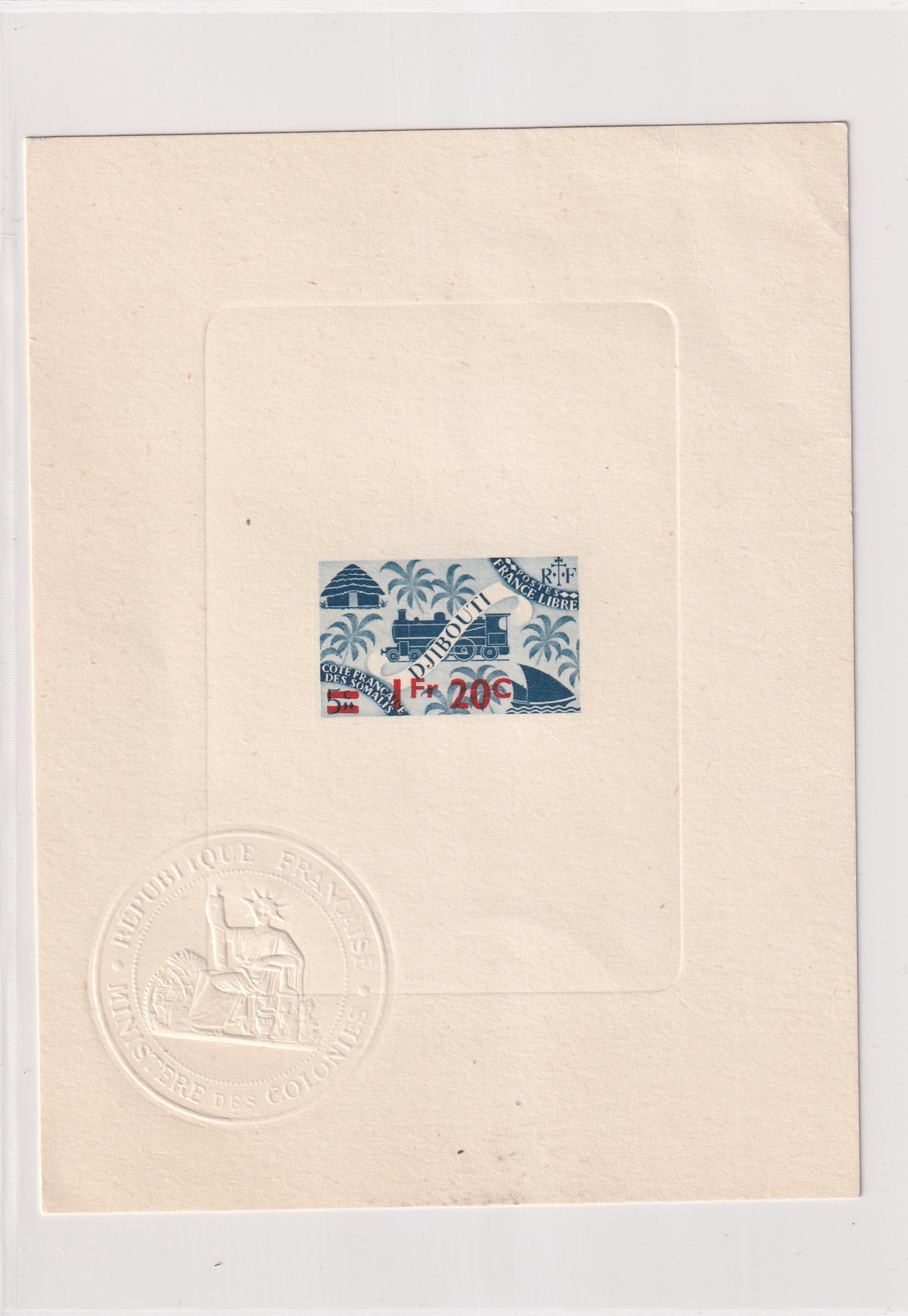 Djibouti 1F 20c Red Overprint Large Die Proof. Added Monday, February 23, 2026