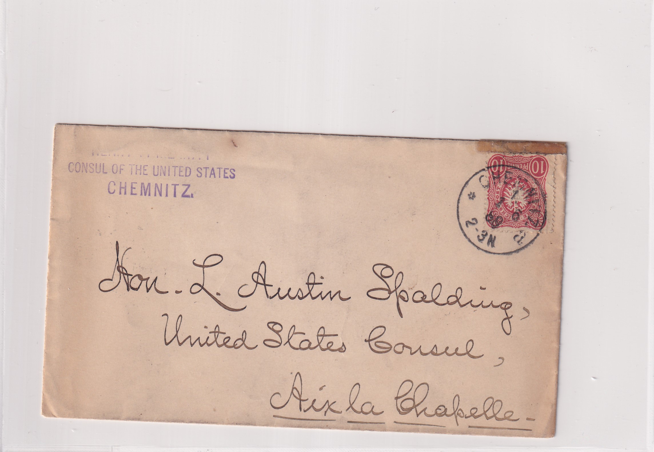 1889 U.S. Consulate Chemnitz to Aixla Chapelle, Germany. back stamped Aixla. Added Thursday, February 26, 2026