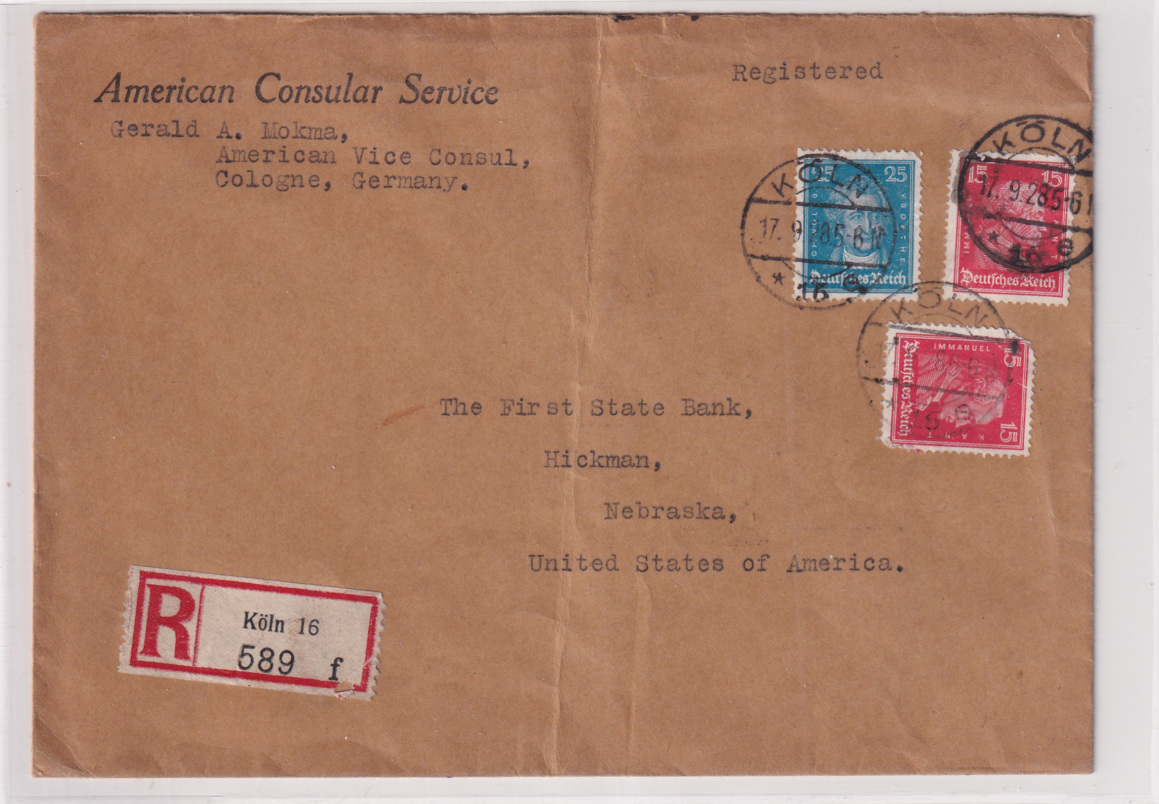 1928 U.S. Consulate Cologne, Germany to Hickman, Ne Registered. back stamped New York. Added Thursday, February 26, 2026