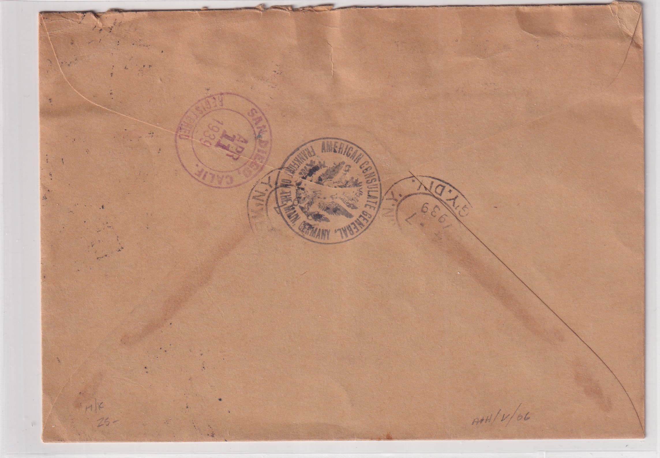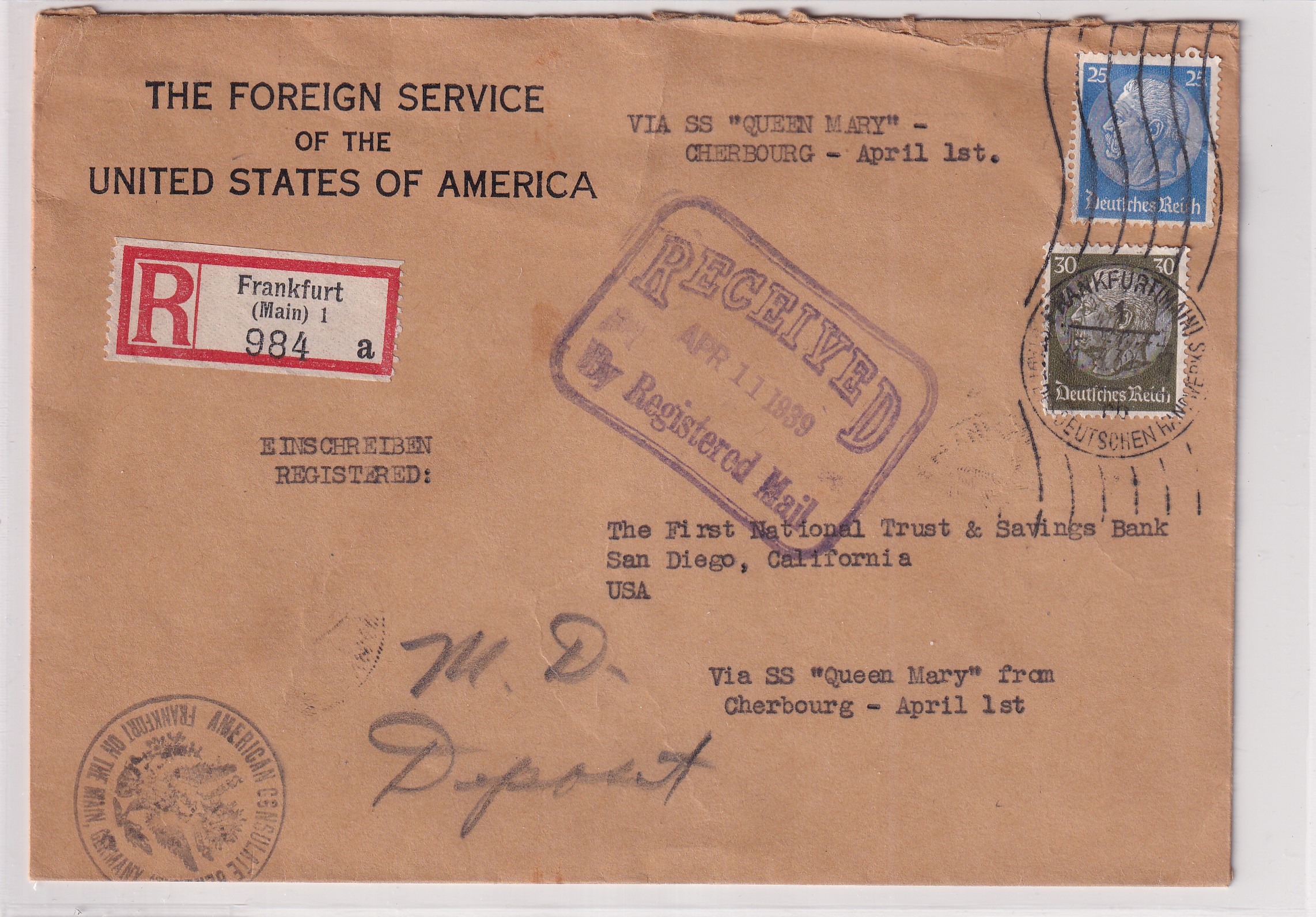 1939 U.S. Consulate Frankfurt, Germany to San Diego, Ca Registered via SS Queen Mary. back stamped New York & San Diego. Added Thursday, February 26, 2026