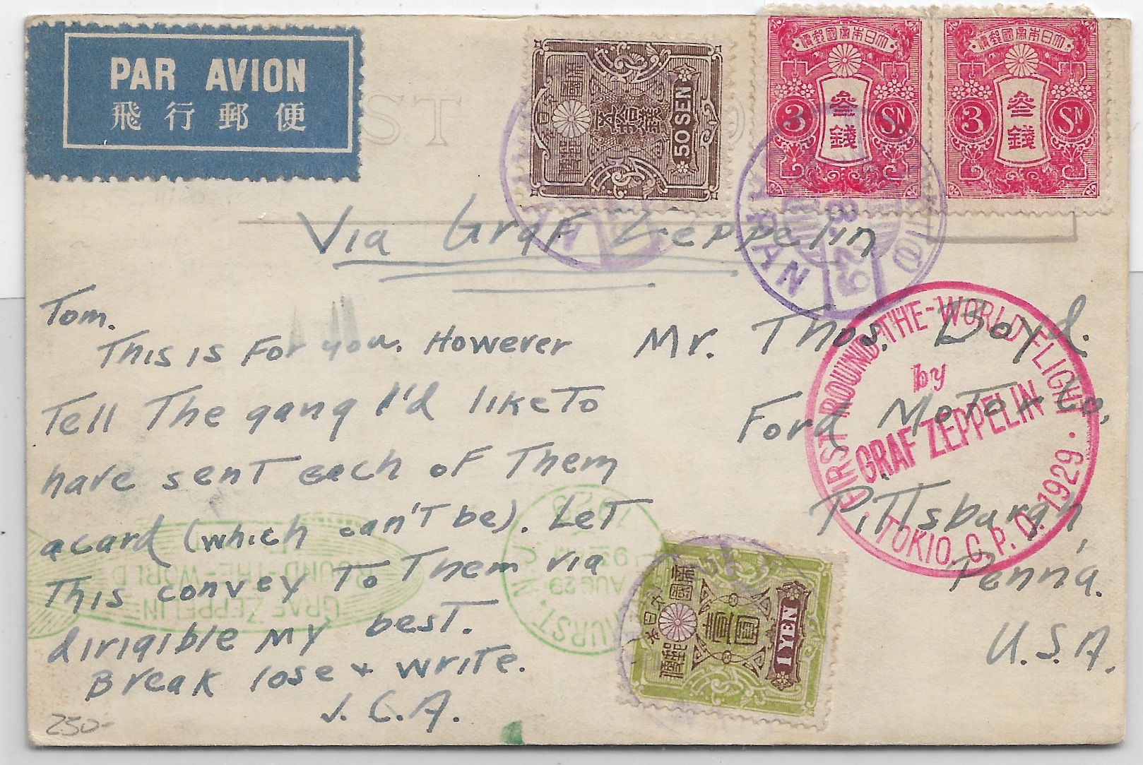 | 1929 Tokyo, Japan to Pittsburg, Pa via Graf Zeppelin. Also stamped Lakehurst. Added Sunday, September 14, 2025 | Price: $250.00