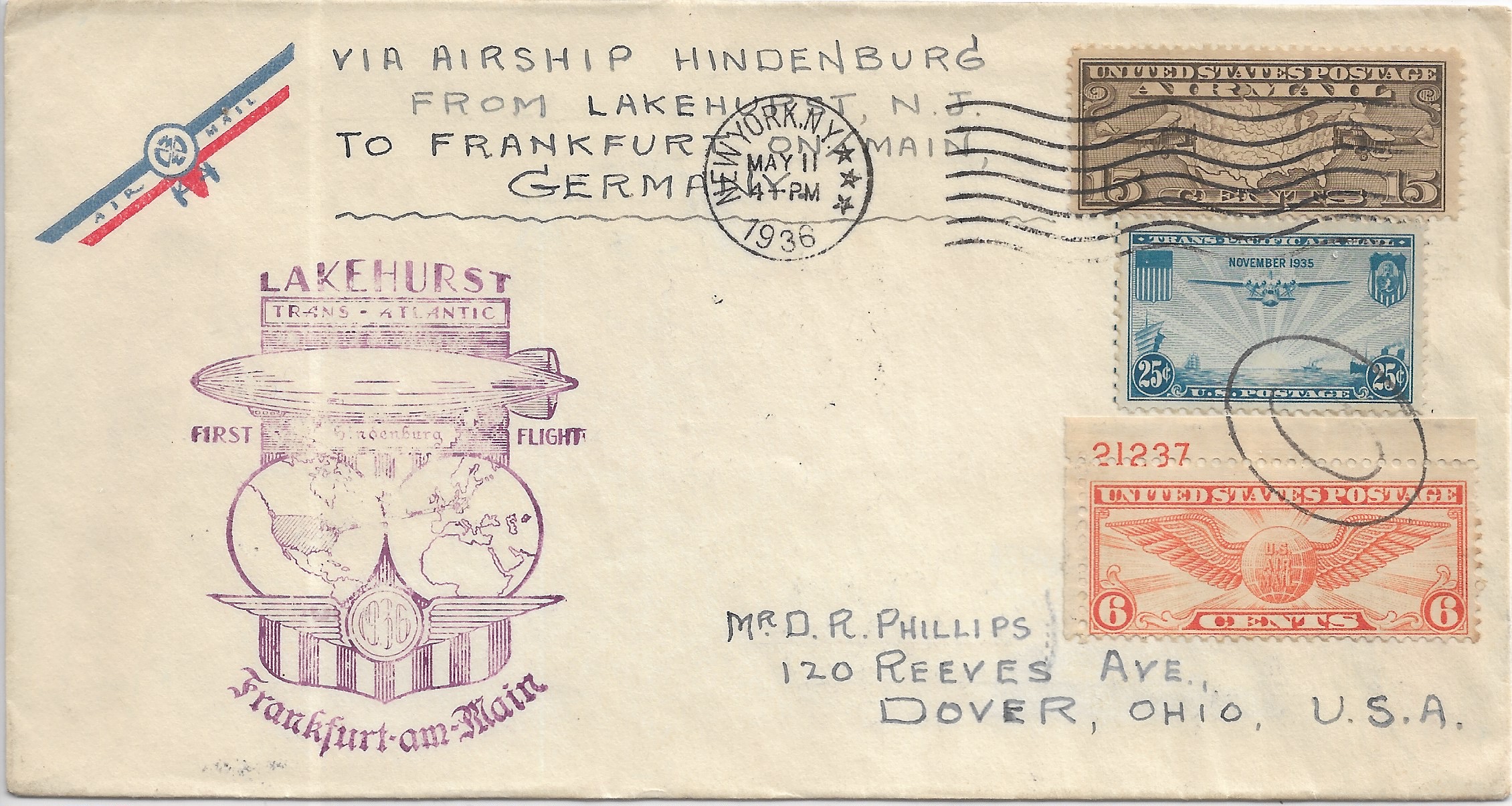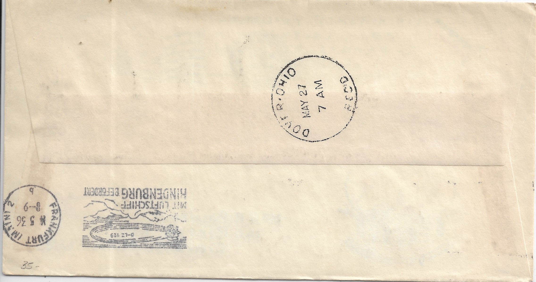 | 1936 New York, NY to Frankfurt-Main, Germany to Dover, OH 1st Flt Hindenburg. back stamped Frankfurt & Dover. Added Sunday, September 14, 2025 | Price: $35.00