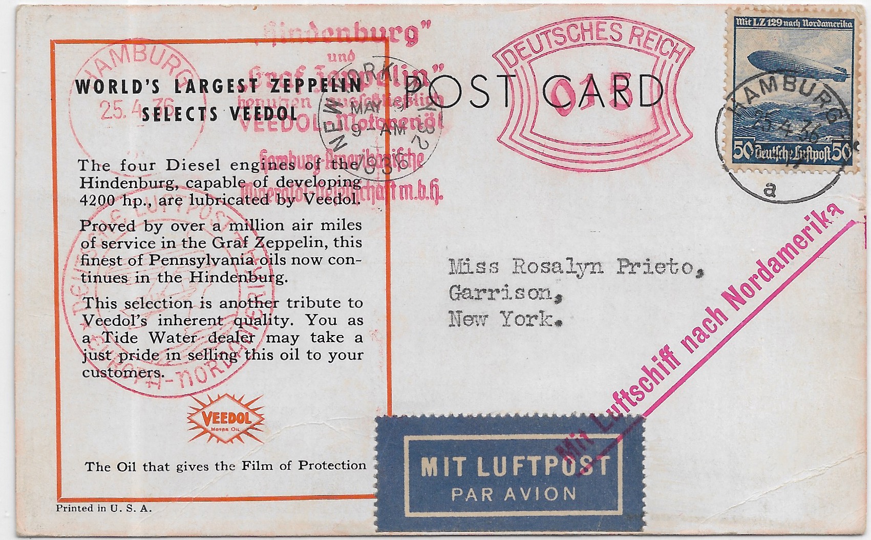 | 1936 Hamburg, Germany to Garrison, NY 1st Flight Hindenburg. Added Sunday, September 14, 2025 | Price: $50.00