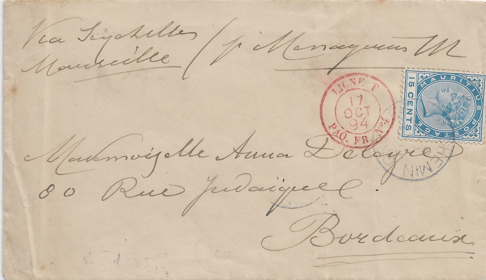 | 1894 Mauritius to Bordeaux, France. back stamped Mauritius. Added Sunday, October 12, 2025 | Price: $125.00