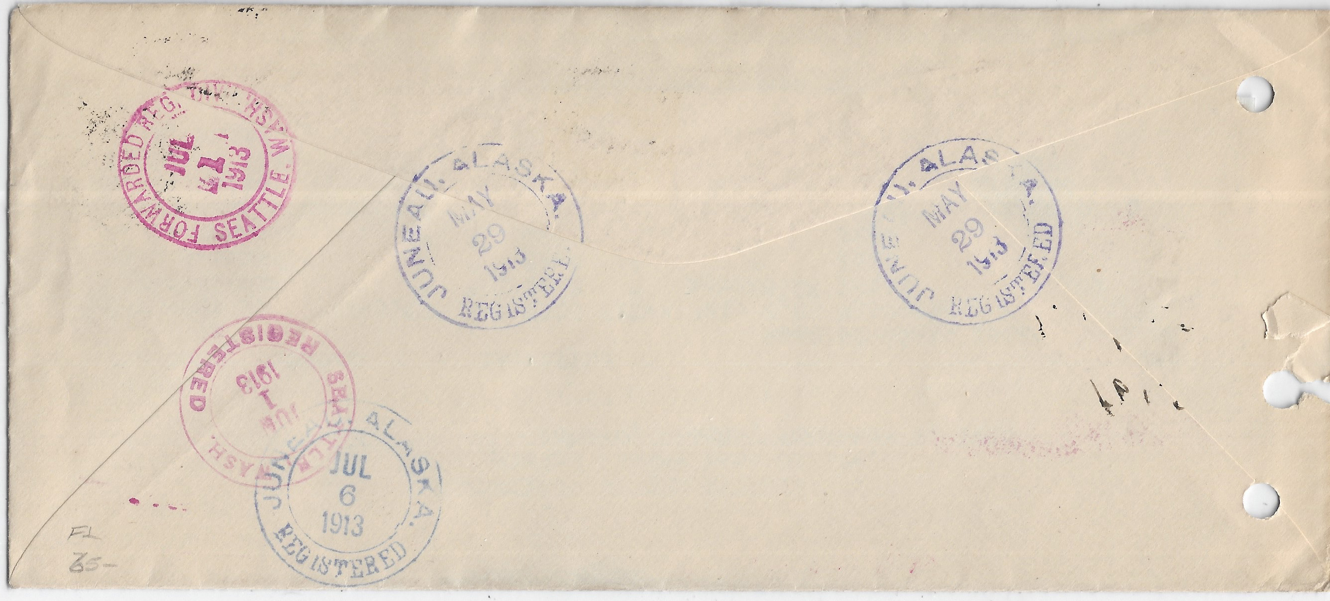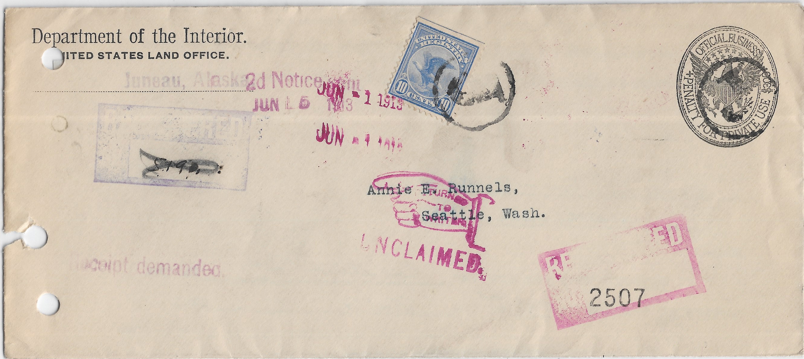 1919 Dept of Interior, Juneau, AK to Seattle, Wa, Official Registered, RTS (Sc # F1 solo). back stamped Juneau & Seattle. Added Sunday, November 9, 2025