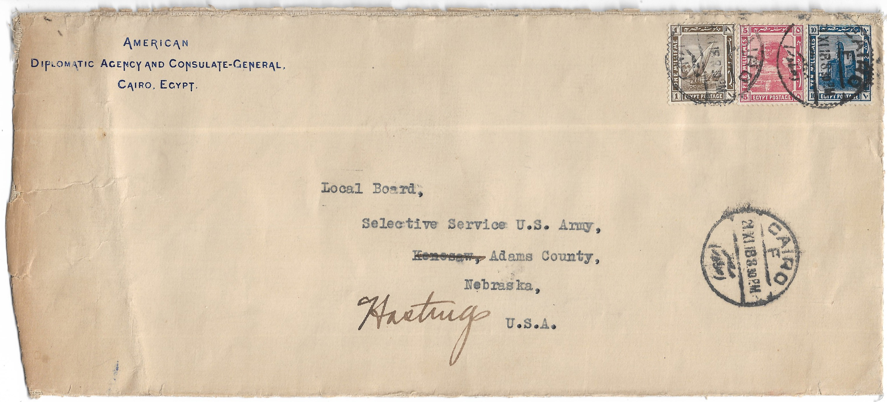 1918 American Consulate, Cairo, Egypt to Kennesaw, Ne, fwd Hastings. large cover. Added Sunday, November 9, 2025