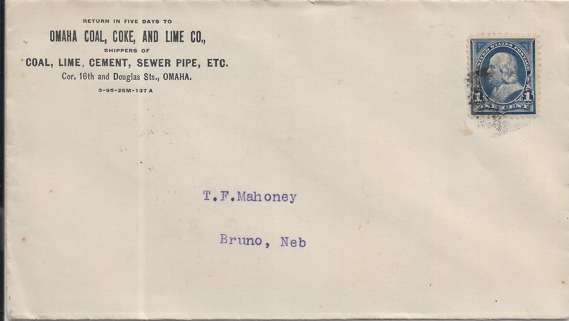 Advertising: 1896 Omaha Coal, Coke & Lime, Omaha to Bruno, Ne. back stamped Bruno. Added Saturday, November 8, 2025