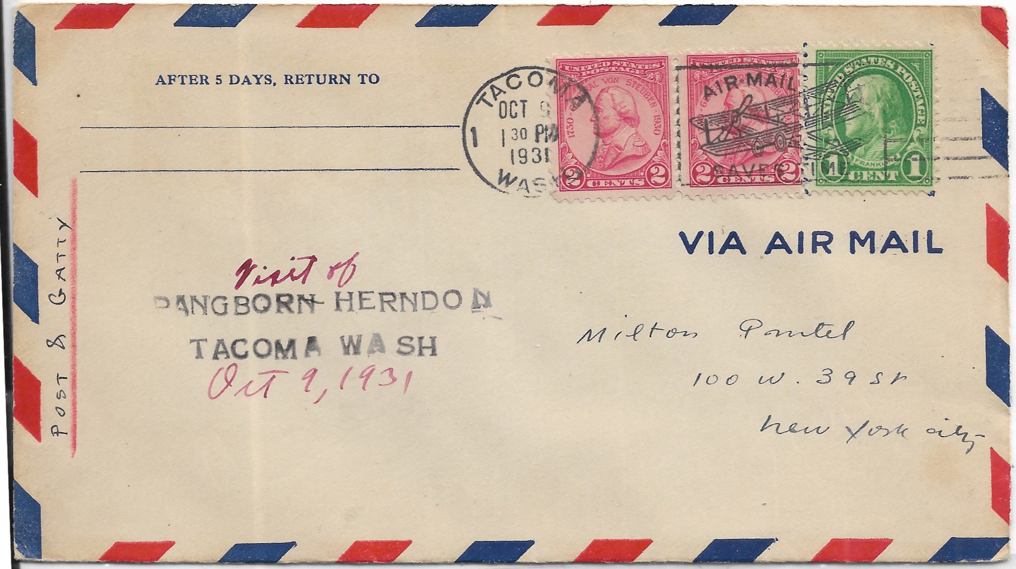 1931 Tacoma, Wa to New York, NY Airmail. Pangborn-Herndon Visit. Added Saturday, November 8, 2025