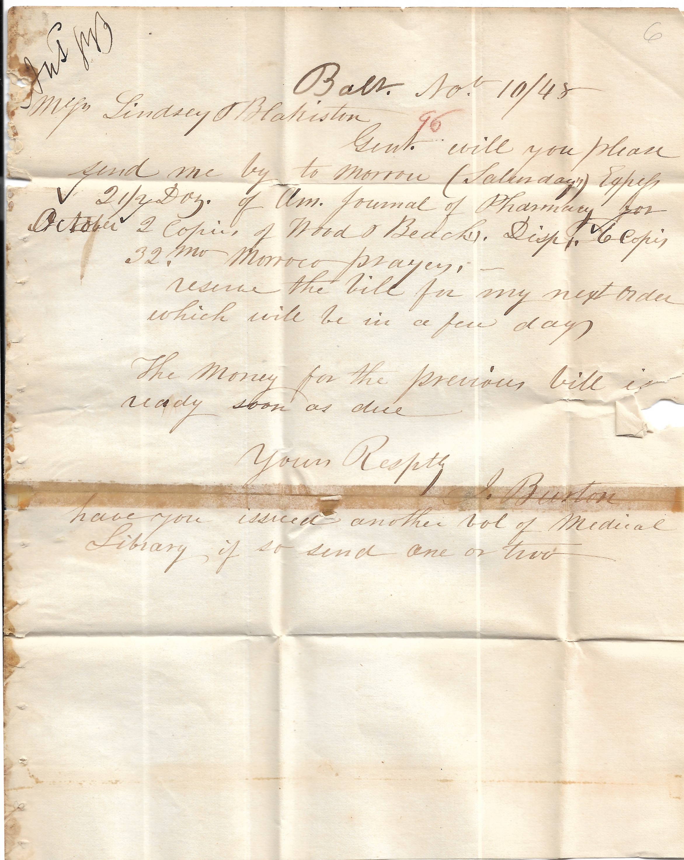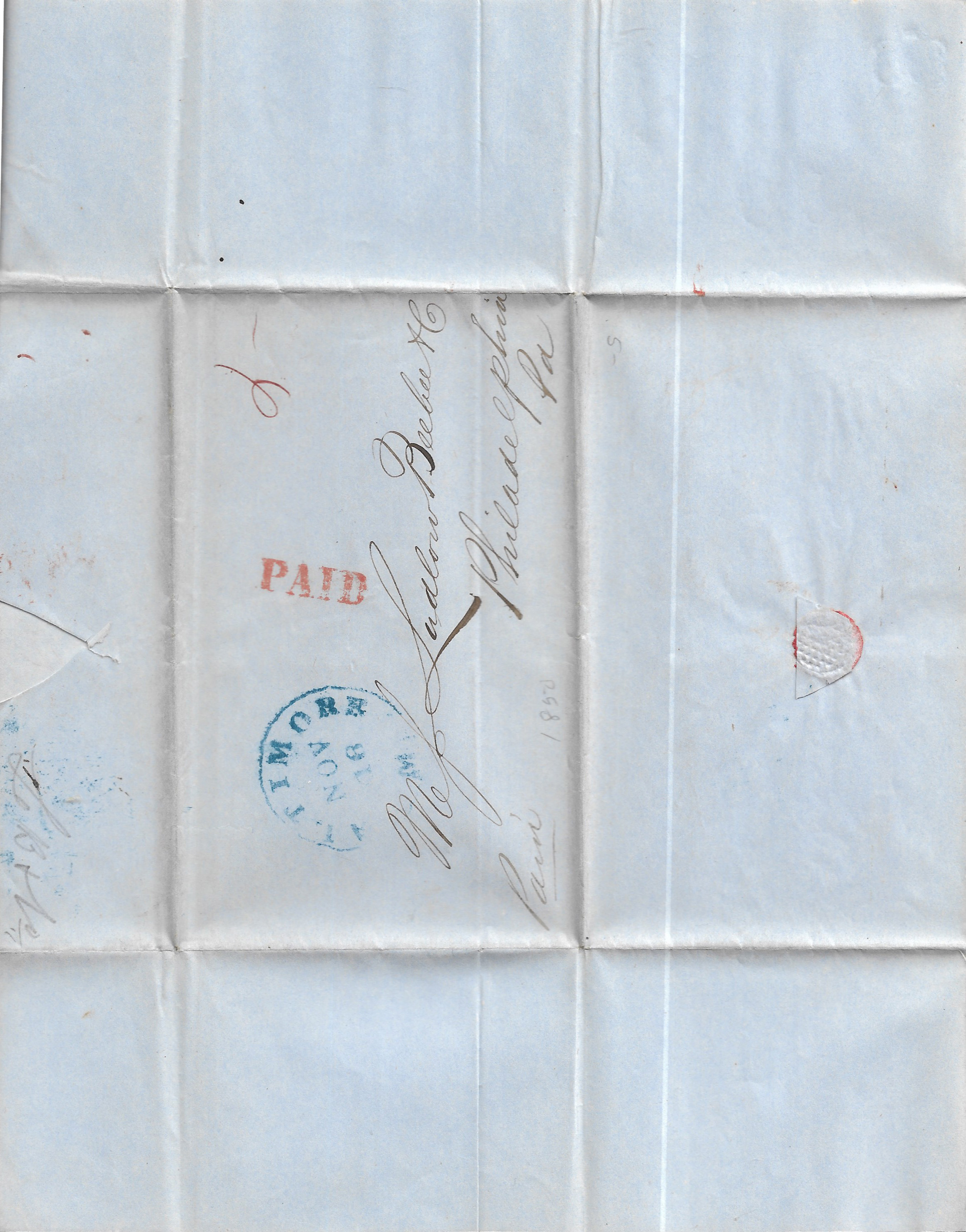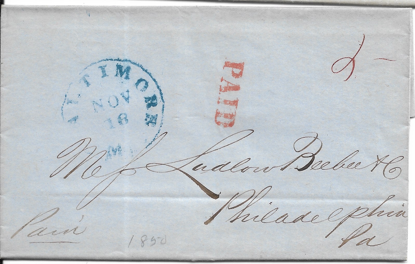 Stampless: 1850 Baltimore, MD to Philadelphia, Pa. Added Saturday, November 8, 2025