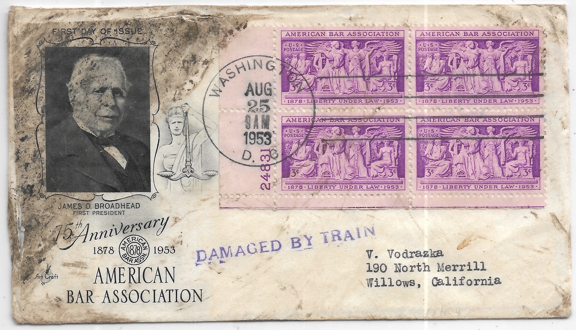 1953 3c American Bar Association FDC to Willows, Ca DAMAGED BY TRAIN. Added Sunday, November 9, 2025