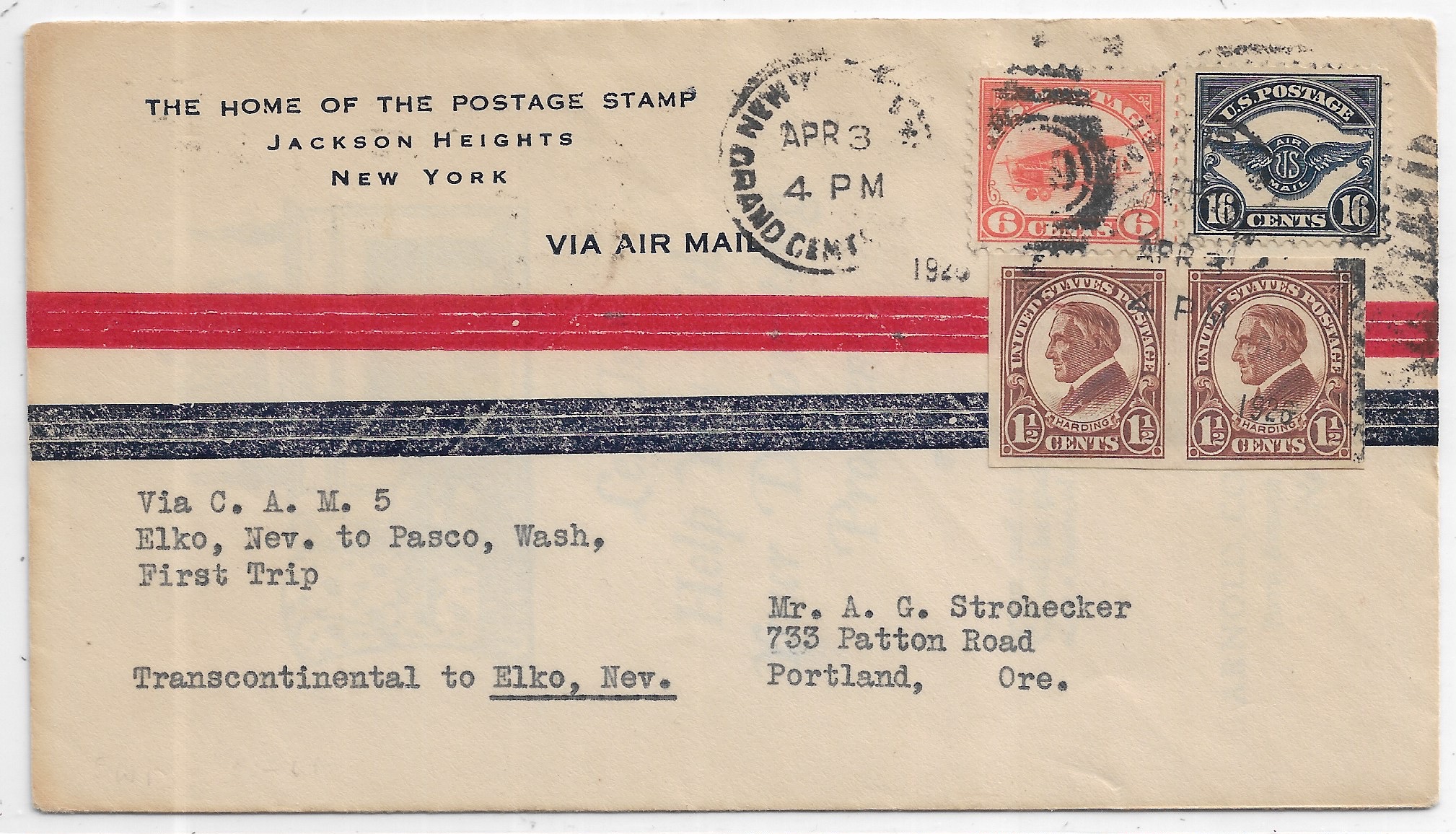 1928 New York, NY to Portland, Or via 1st Flight Elko, NV to Pasco, Wa. back stamped Pasco. Added Sunday, November 16, 2025