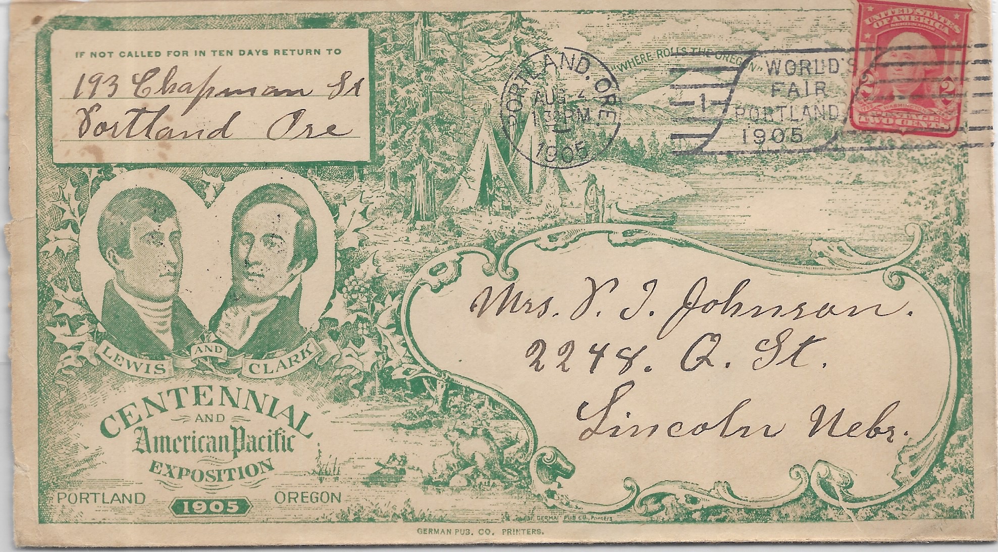 Advertising: 1905 Lewis & Clark Centennial Expo, Portland, Or to Lincoln, Ne. back stamped Lincoln. Added Sunday, November 16, 2025