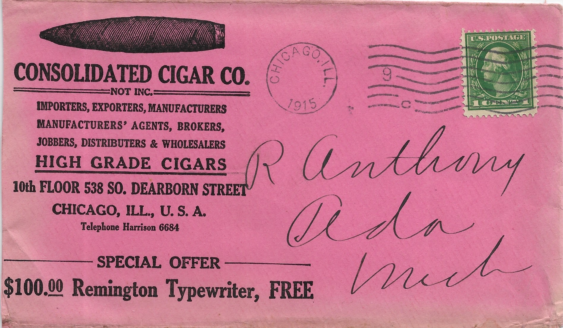 Advertising: 1915 Consolidated Cigar Co, Chicago, Il to Ada, Mi. Added Sunday, November 16, 2025