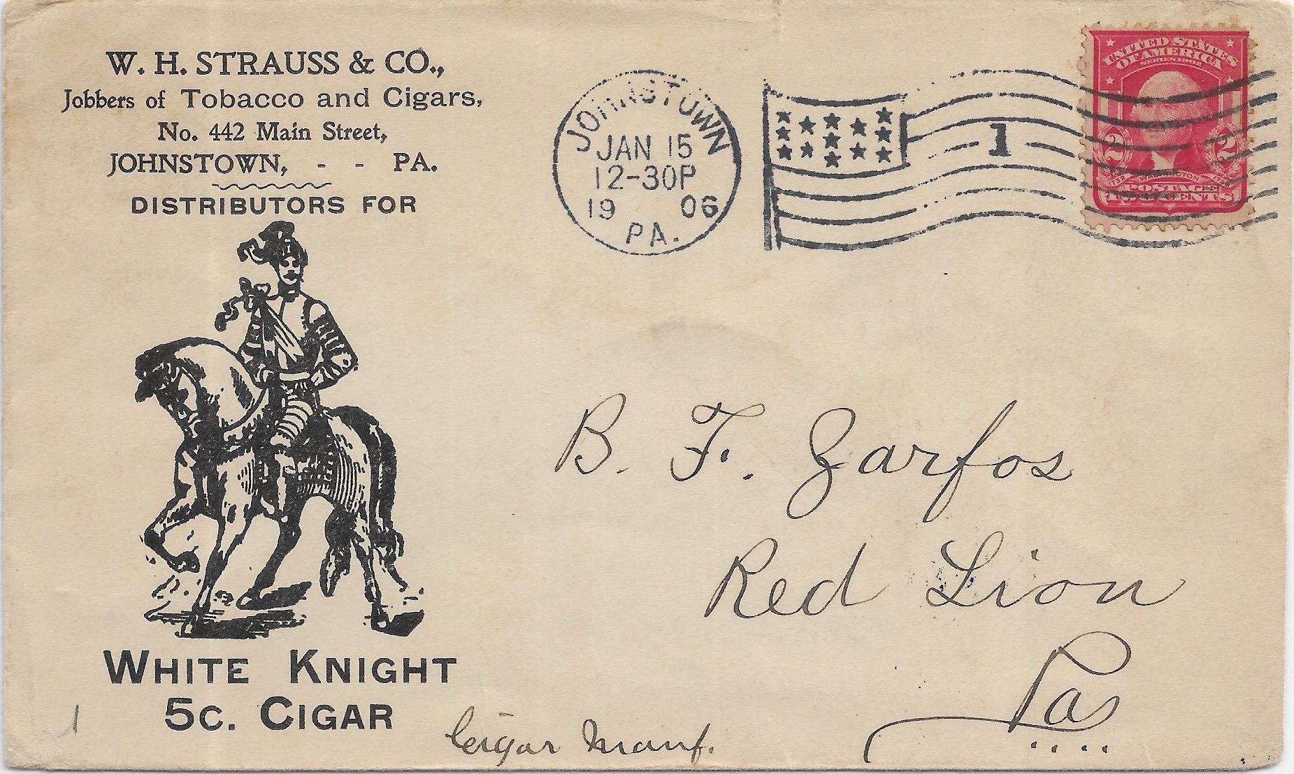 Advertising: 1906 White Knight Cigars, Johnstown to Red Lion, Pa. back stamped Red Lion. Added Sunday, November 16, 2025