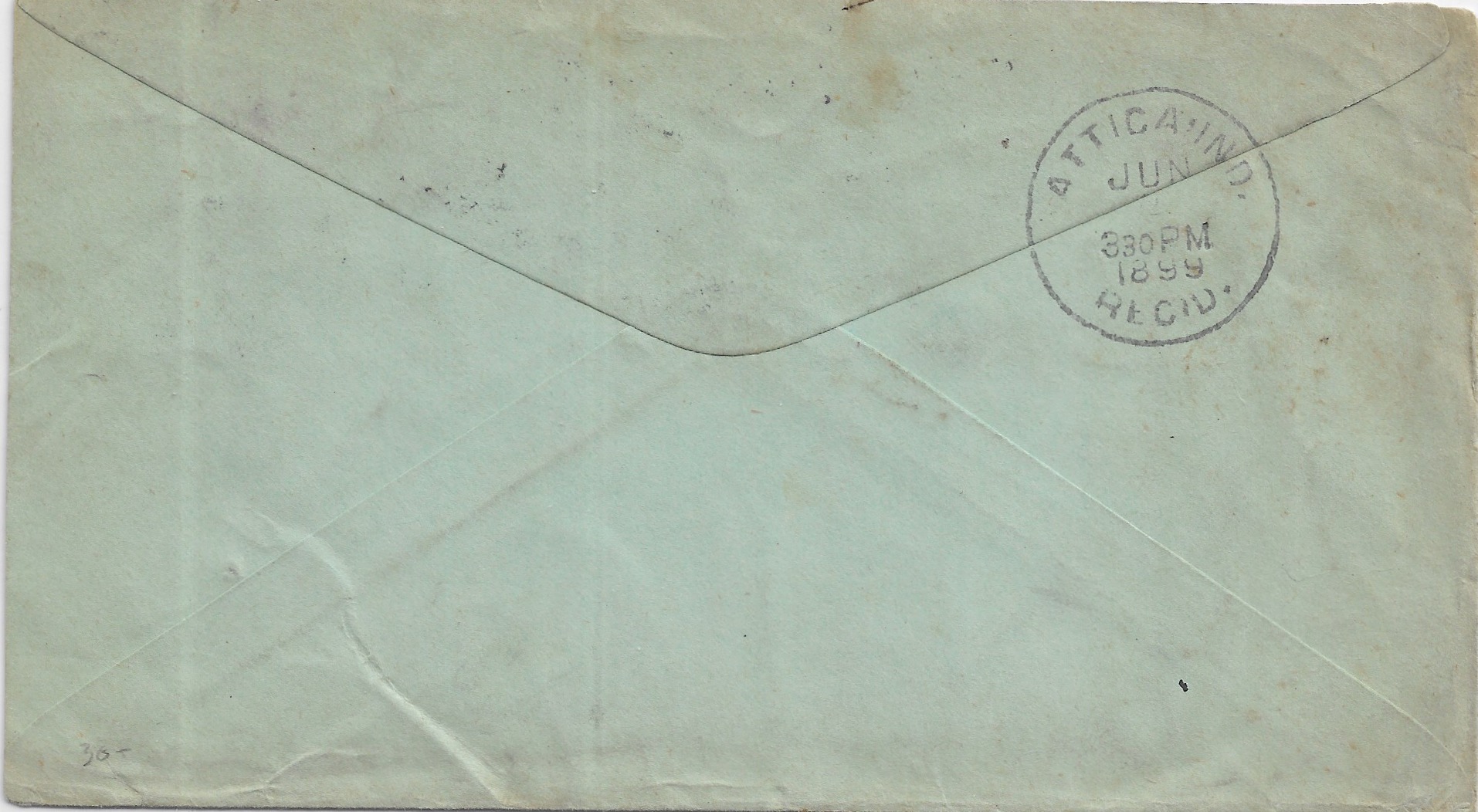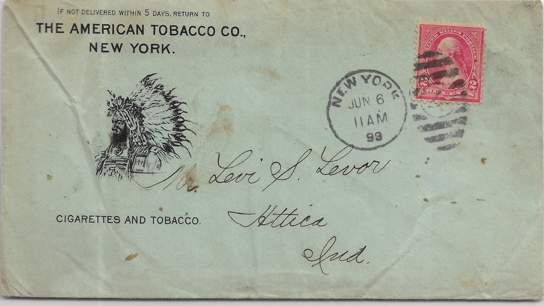 Advertising: 1899 American Tobacco Co, New York, NY to Attica, IN. back stamped Attica. Added Sunday, November 16, 2025